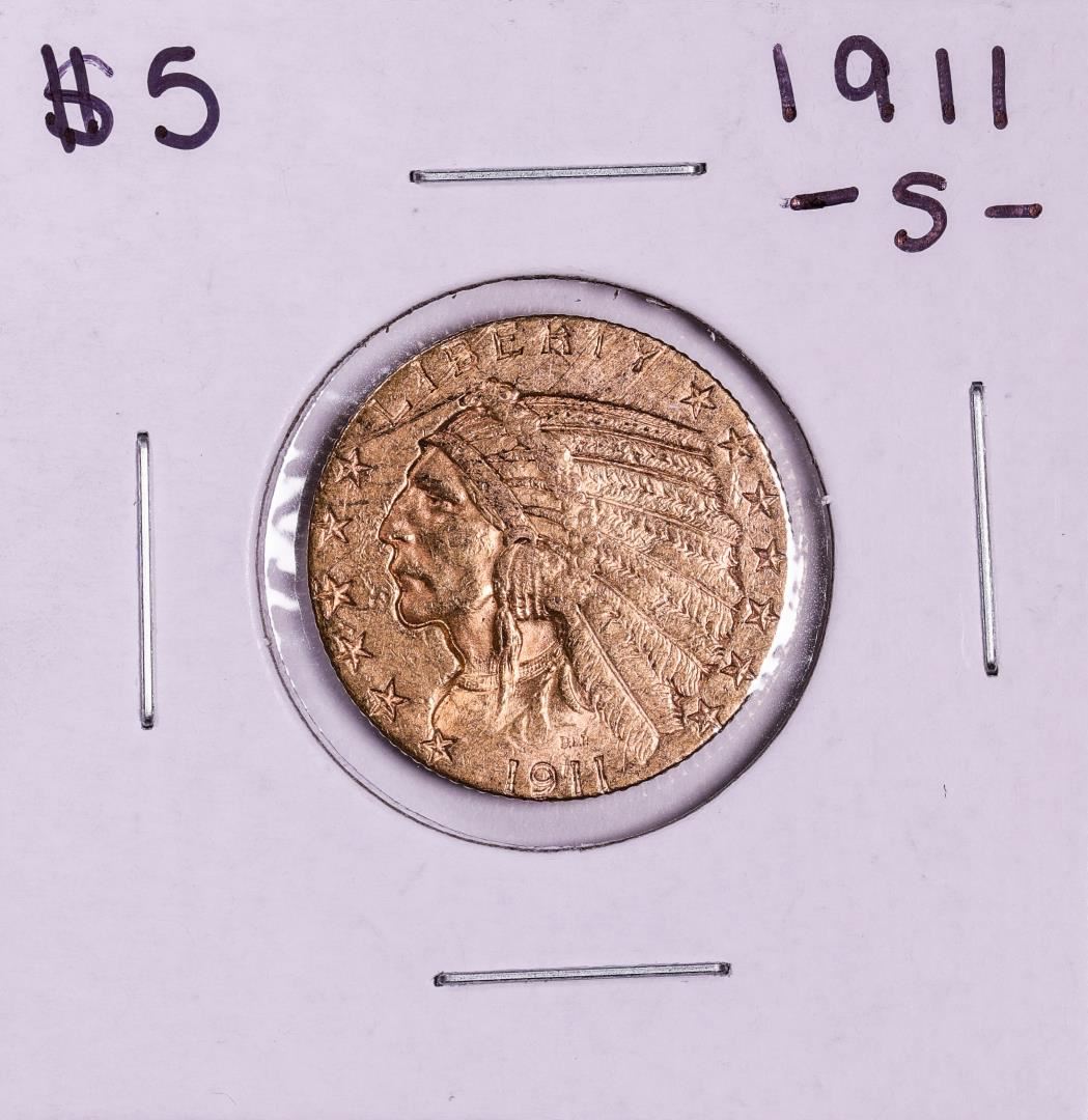 One 1911-S $5 Indian Head Half Eagle Gold Coin.