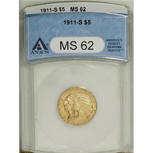 <B>1911-S $5 MS62 ANACS.</B></I> While the second most common S-mint in Mint State, the 1911-S can nevertheless be classified as a scarce coin in Uncirculated condition. This is a moderately well struck coin with complete (although somewhat dull) mint luster, and normal marks for the grade.<BR><BR><b>Shipping:</b> Coin/Currency (<a target="_blank" href="http://www.heritageauctions.com/common/shipping.php">view shipping information</a>)