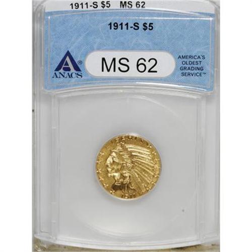 <B>1911-S $5 MS62 ANACS.</B></I> . NGC Census: (212/64). PCGS Population (240/126). Mintage: 1,416,000. Numismedia Wsl. Price for NGC/PCGS coin in MS62: $2,050. (#8522)<BR><BR><B>Coin Engraver:</B> Bela Lyon Pratt<BR><BR><b>Shipping:</b> Coins & Currency (<a target="_blank" href="http://www.heritageauctions.com/common/shipping.php">view shipping information</a>)