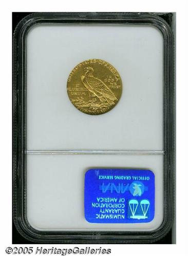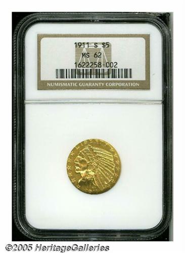 <B>1911-S<$5> MS62 NGC.</B></I> A relatively scarce issue in Mint State condition. With the exception of softness on the eagle's left shoulder, the design elements are well impressed. A few minute contact marks are seen on the Indian's cheek and in the open exposed fields, particularly on the upper reverse.