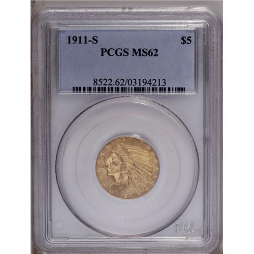 1911-S $5 MS62 PCGS. Boldly struck and satiny, with a