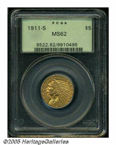 <B>1911-S<$5> MS62 PCGS.</B></I> Tan toning visits this nicely struck and conditionally scarce S-mint Half Eagle. Orange color fills recessed areas. In a green label holder.