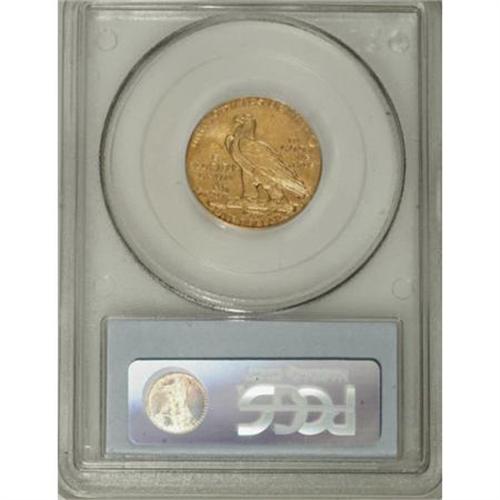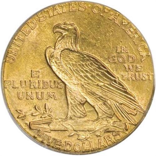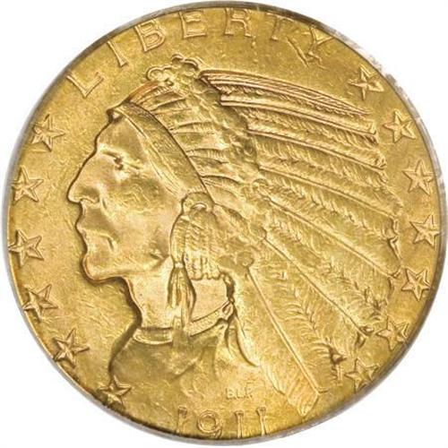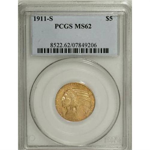 <B>1911-S $5 MS62 PCGS.</B></I> Just five years after a massive earthquake and fire devastated San Francisco but left the Mint standing, that facility was in full swing, as evidenced by an ample production of over 1.4 million half eagles in 1911. This example has a softly shimmering orange-gold obverse, while the reverse has slightly lighter color and stronger luster. An abrasion is noted at the Indian's jawline.<BR><BR><B>Coin Engraver:</B> Bela Lyon Pratt<BR><BR><b>Shipping:</b> Coins & Currency (<a target="_blank" href="http://www.heritageauctions.com/common/shipping.php">view shipping information</a>\)