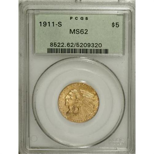 <B>1911-S $5 MS62 PCGS.</B></I> Well-defined with yellow-gold and orange-gold surfaces that take on a brassy appearance. Numerous light to moderate abrasions on and around the devices account for the grade.<BR><I>From The Parker Lee III Collection.</B></I><BR><BR><B>Coin Engraver:</B> Bela Lyon Pratt<BR><BR><b>Shipping:</b> Coins & Currency (<a target="_blank" href="http://www.heritageauctions.com/common/shipping.php">view shipping information</a>)