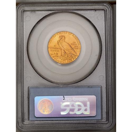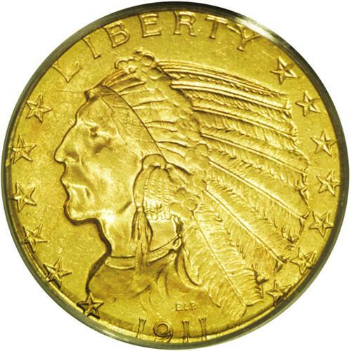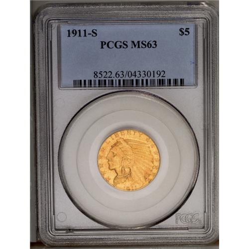 <B>1911-S<$5> MS63 PCGS.</B></I> A surprisingly well-struck example of this issue, which is normally found with poor definition. Moderately abraded with highly lustrous and brilliant orange-gold surfaces. An enigmatic issue with the second highest mintage of any Indian half eagle, yet the 10th rarest (out of 24 issues) in Mint State grades, and the seventh rarest in MS64 or finer grades. Despite a production of more than 1.4 million coins, this issue is clearly not a common date. David Akers commented: "All in all, this is one of the most underrated issues of the series, if not the entire spectrum of 20th century United States gold coins."