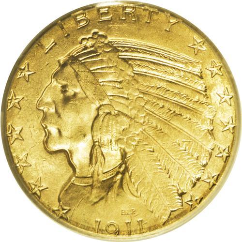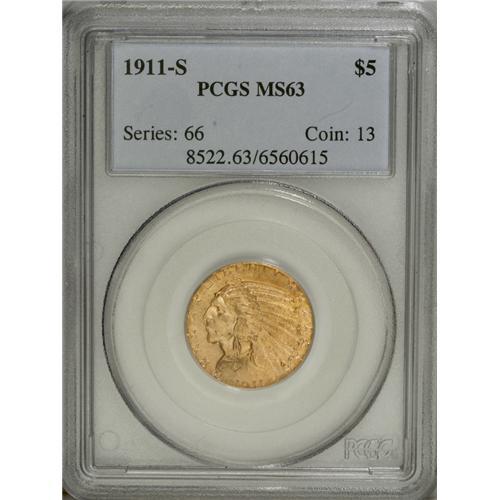 <B>1911-S $5 MS63 PCGS.</B></I> An orange-gold example with a few dashes of olive toning. Luster dominates the lightly abraded fields, and the strike is good aside from the usual incompleteness on the bottom headdress feathers. Since gold coins circulated to some extend on the West Coast in 1911, the 1911-S is more difficult in Mint State than its mintage implies.<BR><I>From The Dr. Eugene Cherny Collection of $5 and $10 Indians.</B></I><BR><BR><b>Shipping:</b> Coin/Currency (<a target="_blank" href="http://www.heritageauctions.com/common/shipping.php">view shipping information</a>) <BR><BR><B>Importan