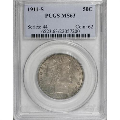 <B>1911-S 50C MS63 PCGS.</B></I> Lilac and gray toning lightly coats both sides. The luster is a bit subdued and a few minor, unobtrusive marks are seen, consistent with the grade. The design features are well impressed throughout. Decidedly scarce at the Mint State level. Population: 12 in 63, 36 finer (11/07).<BR><BR><B>Coin Engraver:</B> Charles E. Barber<BR><BR><b>Shipping:</b> Coins & Currency (<a target="_blank" href="http://www.heritageauctions.com/common/shipping.php">view shipping information</a>)