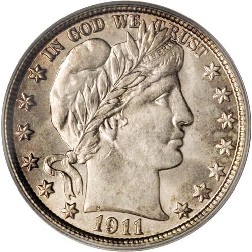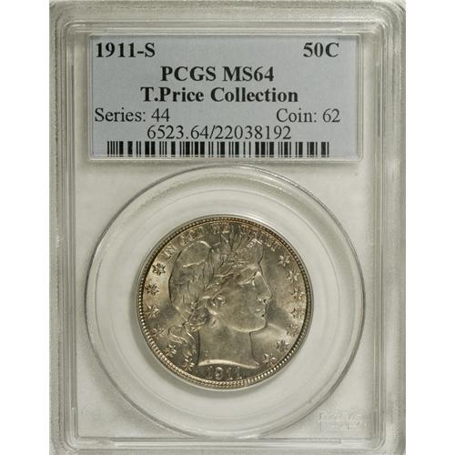 <B>1911-S 50C MS64 PCGS.</B></I> Ex: T. Price Collection. A well struck and highly lustrous example of this often-elusive San Francisco product. Pale gold and green patina covers parts of each side. The fields and reverse are clean overall, though several minor abrasions on the portrait restrict the grade. Population: 19 in 64, 17 finer (3/07).<BR><BR><b>Shipping:</b> Coins & Currency (<a target="_blank" href="http://www.heritageauctions.com/common/shipping.php">view shipping information</a>)