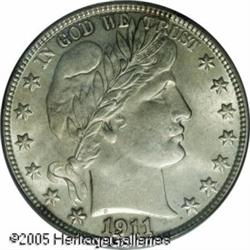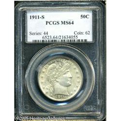 <B>1911-S 50C MS64 PCGS.</B></I> The '11-S Barber Half Dollar is hardly a rare coin in circulated grades, and it is even available on a regular basis in the lowest Mint State grades, but Choice examples are decidedly elusive. This example is sharply struck. The surfaces have satiny luster beneath light champagne color. A few splashes of darker brown toning are present on both sides. The surfaces are not perfect, but one does not expect perfection on an MS64 grade example. A delightful coin that will add immeasurably to a Choice Mint State collection of these coins. Population: 16 in 64, 13 finer (1/05). Lot:7167