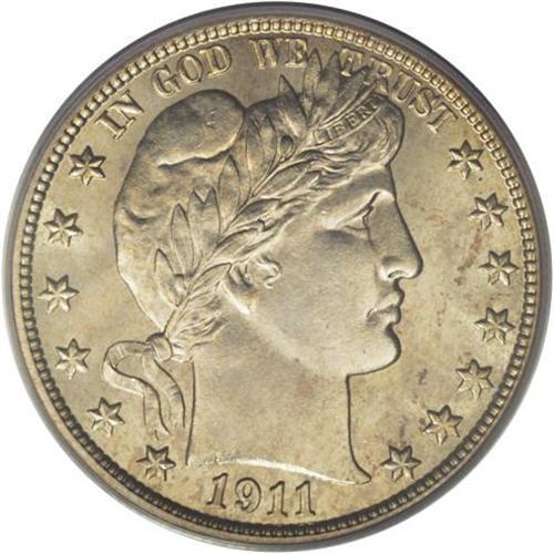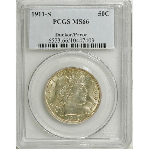 <B>1911-S 50C MS66 PCGS.</B></I> Ex: Duckor/Pryor. Pale yellow-gold toning graces this satiny and unmarked Gem. The strike is decidedly above average, since only the base of the fletchings exhibits any softness. The 1911-S is scarce in Mint State, as expected from its mintage of 1.272 million pieces. Population: 5 in 66, 1 finer (2/07).<BR><I>Ex: Numismatic Enterprises, 2/66; James Bennett Pryor Collection (Bowers and Merena, 1/96), lot 316; Dr. Steven L. Duckor Collection.</B></I><BR><BR><b>Shipping:</b> Coins & Currency (<a target="_blank" href="http://www.heritageauctions.com/common/shipping.php">view shipping information</a>)