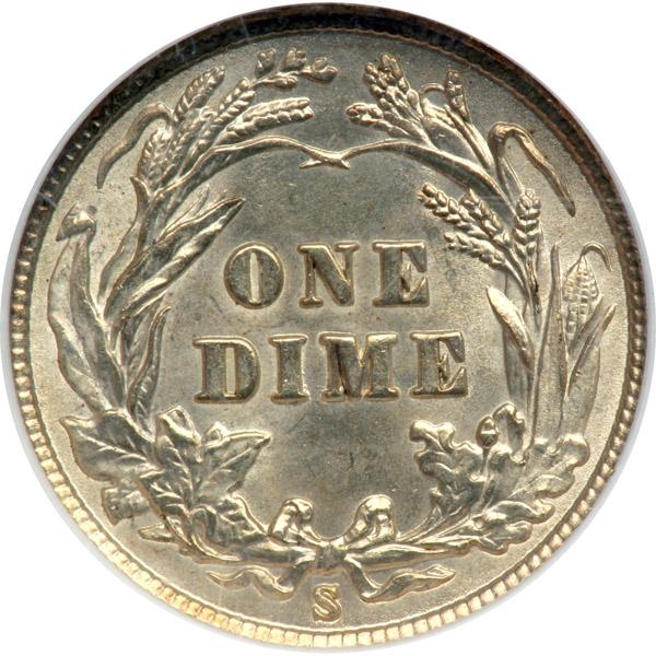 1911-S Barber Dime. NGC graded MS-63. We note a tiny obverse pin scratch, otherwise, a full point higher.