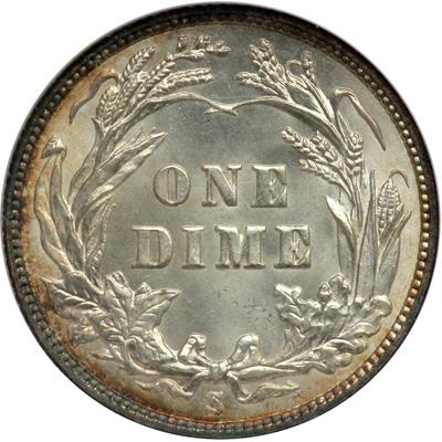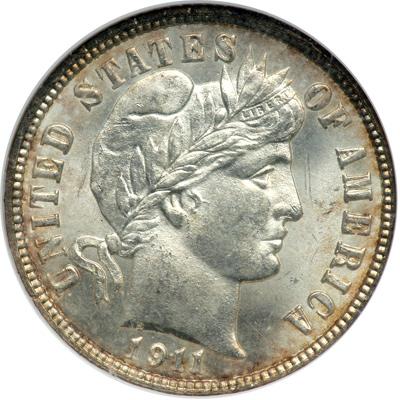 1911-S Barber Dime. NGC graded MS-66. An attractive, well struck and frosty mint gem with a hint of light gold about the borders. Pop 24; 5 in 67, 1 in 68.