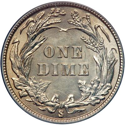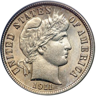 1911-S Barber Dime. PCGS graded MS-64. A hint of light gold tone. Extra frosty luster throughout. Pop 46; 38 in 65; 42 in 66; 8 in 67. (PCGS # 4859).