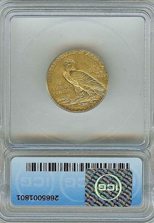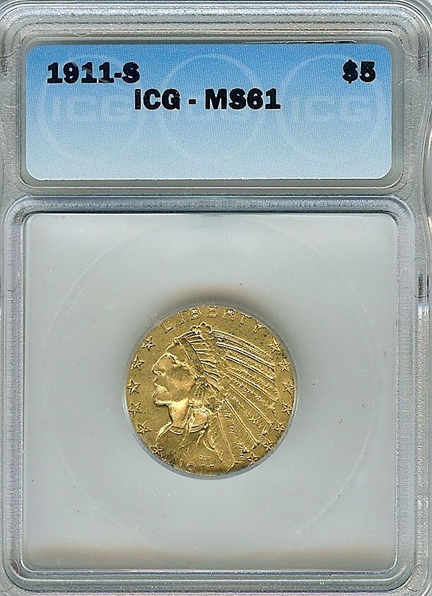 1911-S INDIAN HEAD $5 GOLD HALF EAGLE ICG MS61 SCARCE IN MINT STATE!