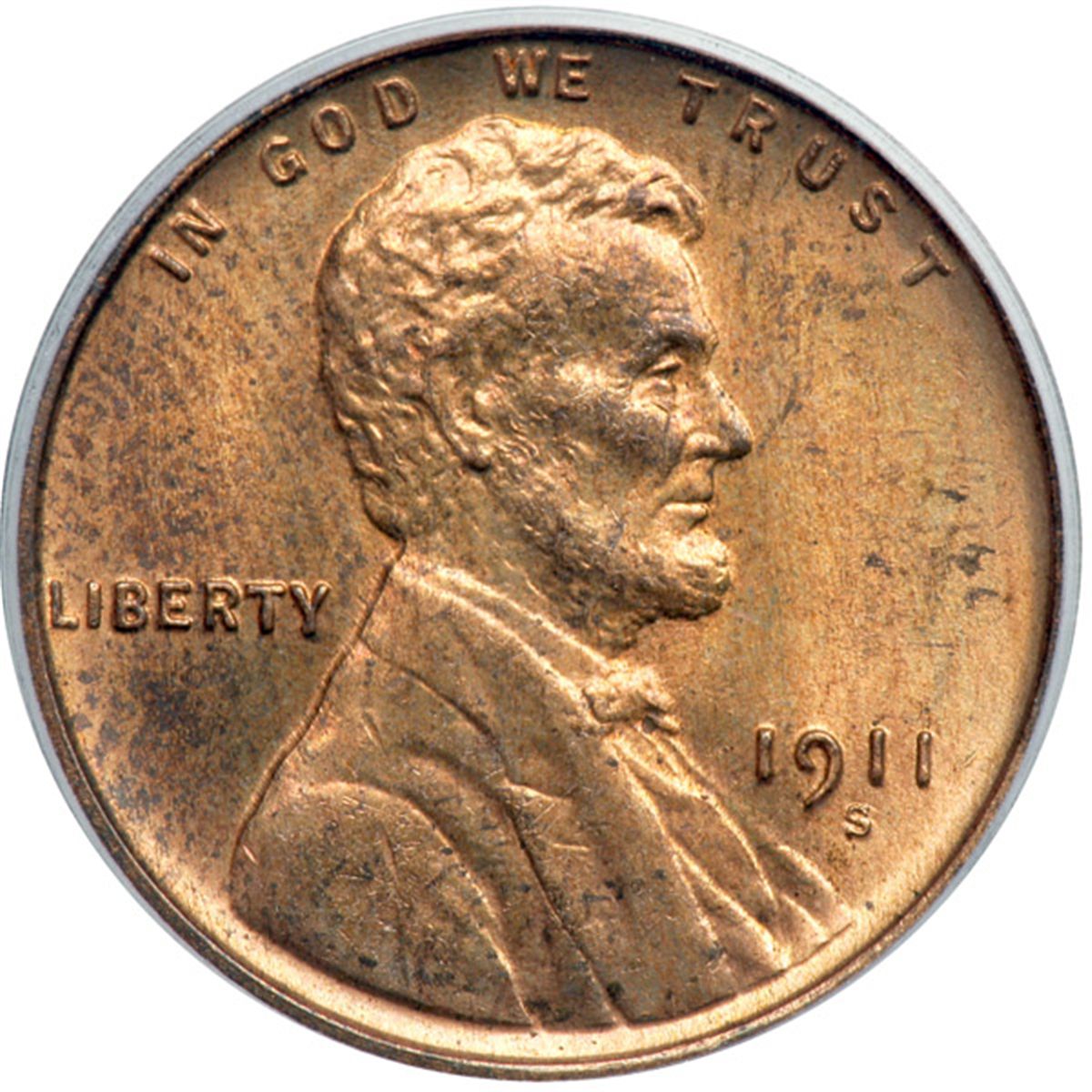 1911-S Lincoln Cent. PCGS graded MS-64 Red & Brown. A gorgeous example with nearly full mint red color. Pop 229; 59 finer in RB (PCGS # 2448) .