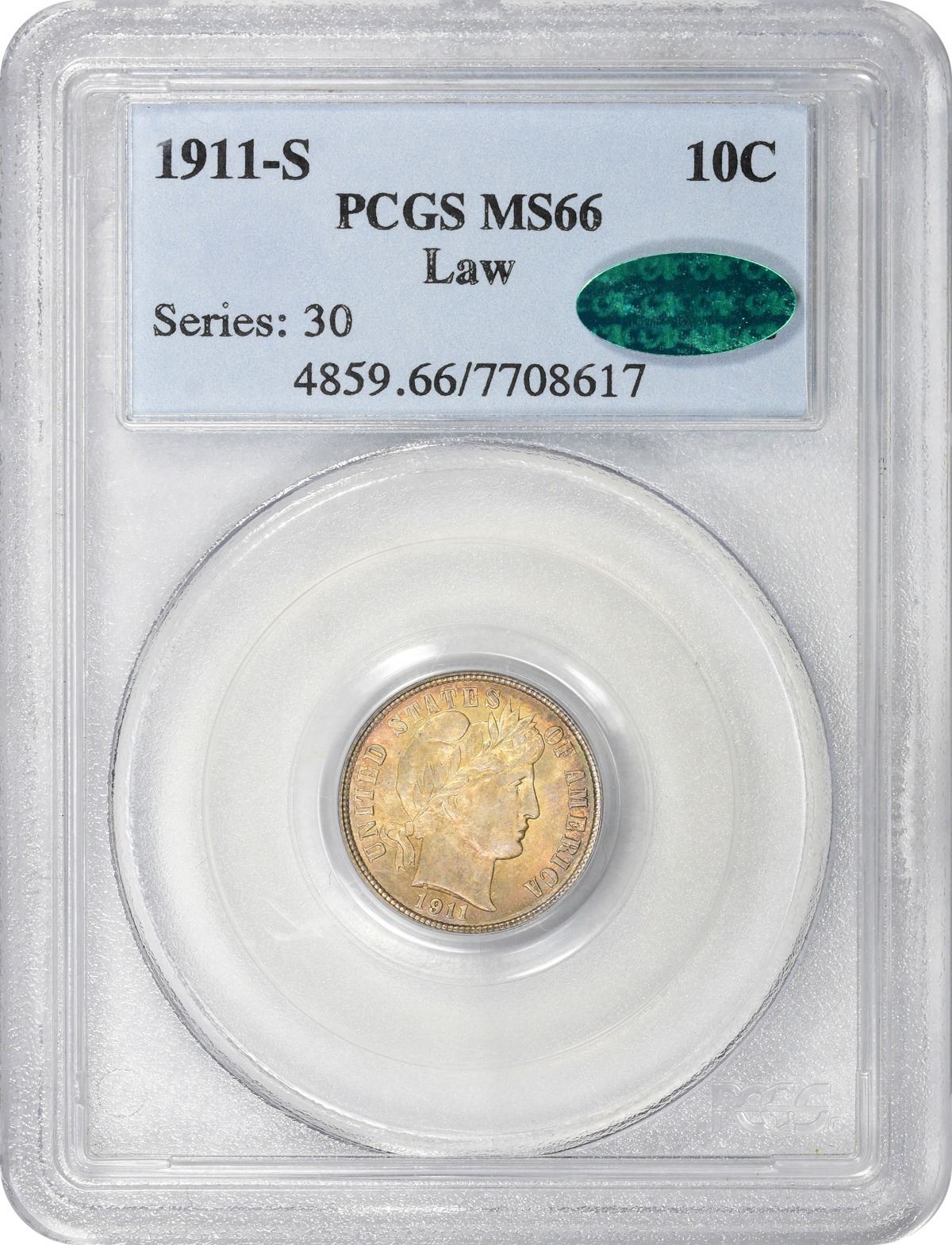 Bursts of bright peach-gold iridescence grace both sides of this sharp branch mint Barber dime. The surfaces are nearly immaculate and maintain their dignity under low magnification. Choice at all levels. PCGS #4859