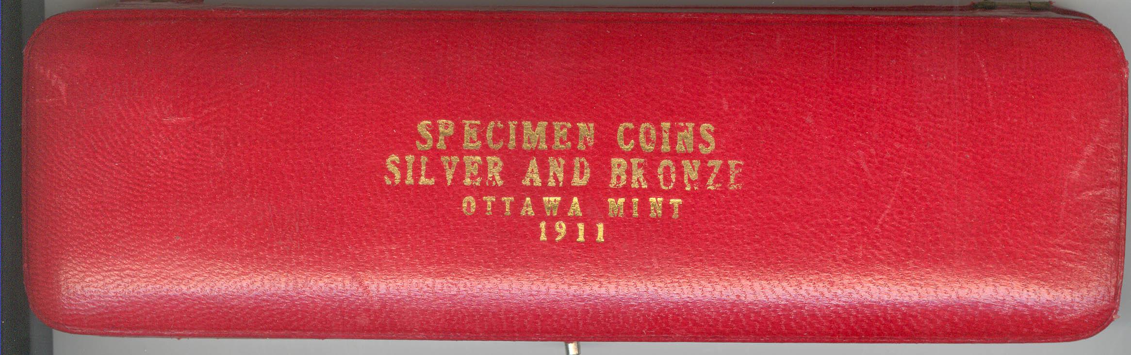 1911, Case number 7b, 1 Cent to 50 Cents. Specimen Coins Silver and Bronze Ottawa Mint 1911 in gold lettering on red casing. In near perfect condition.