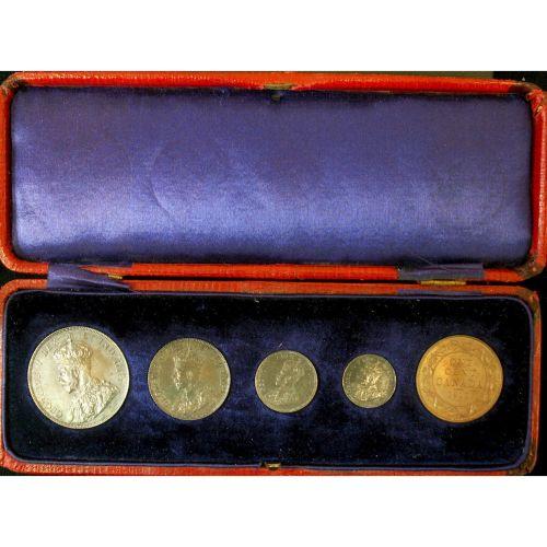 1911 Specimen Set, including the original presentation case. The silver coins are toned and choice, and the Cent is Red and Brown. An extremely rare presentation set.