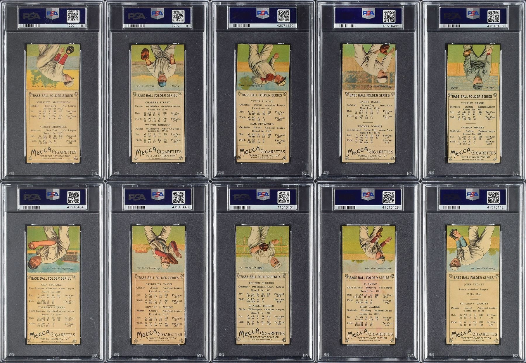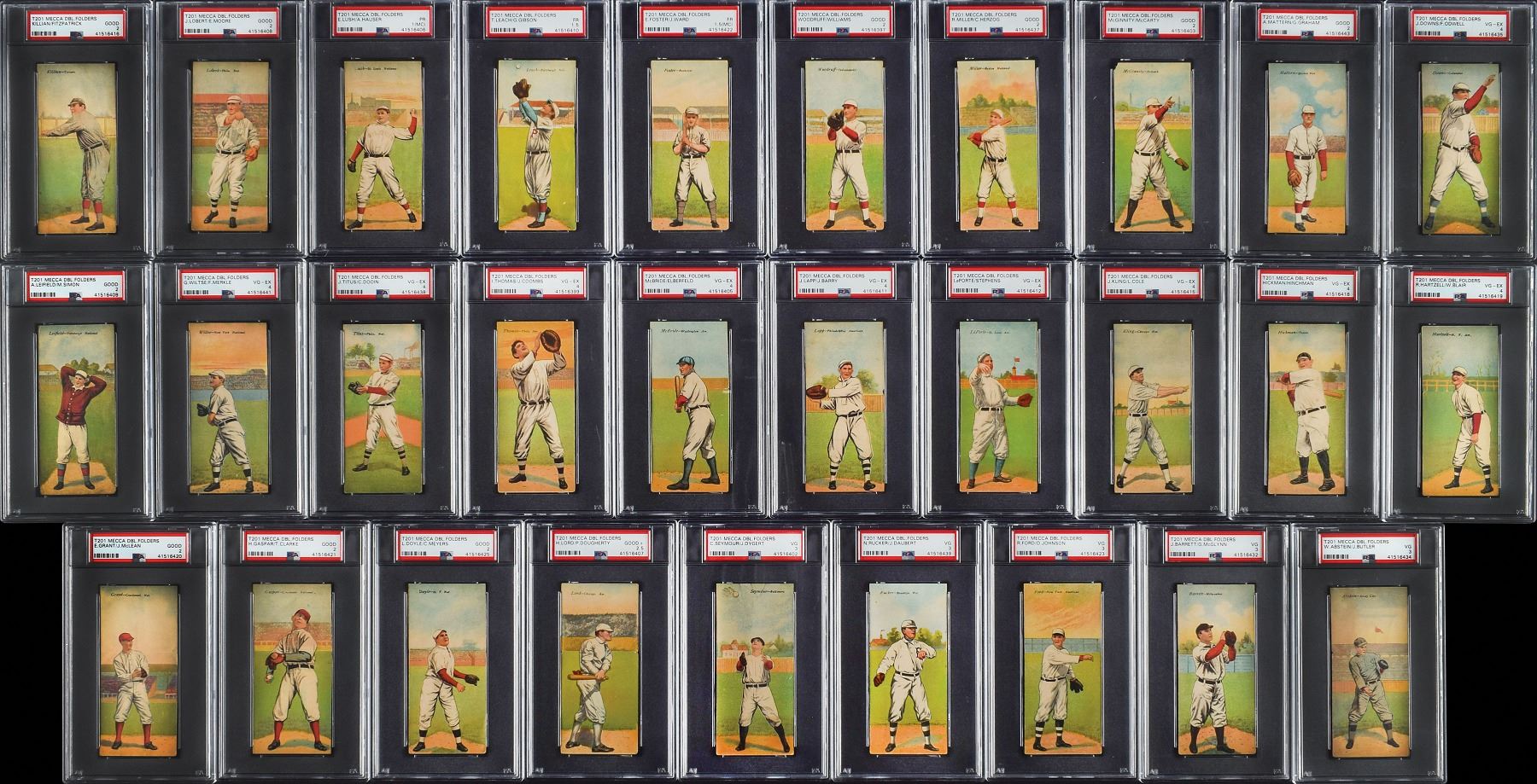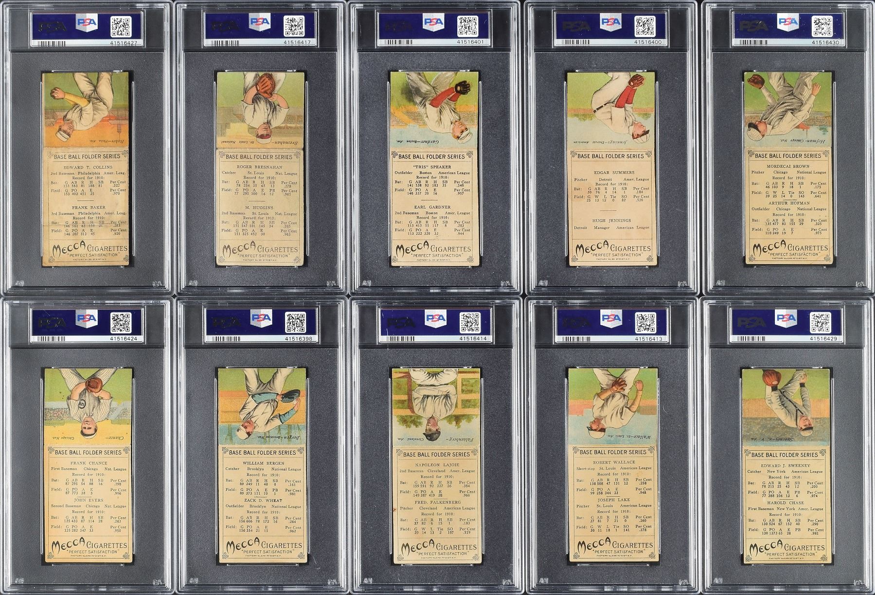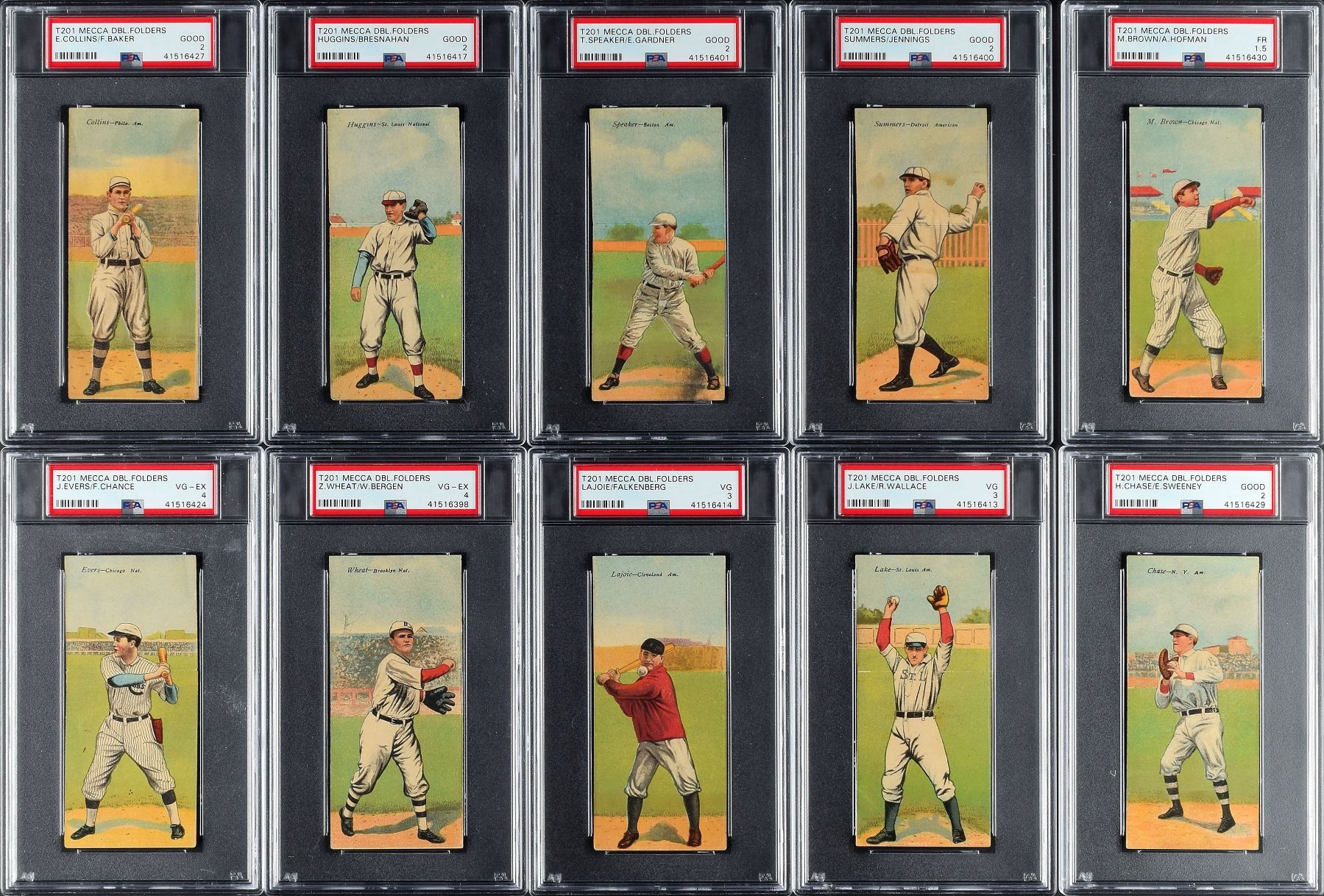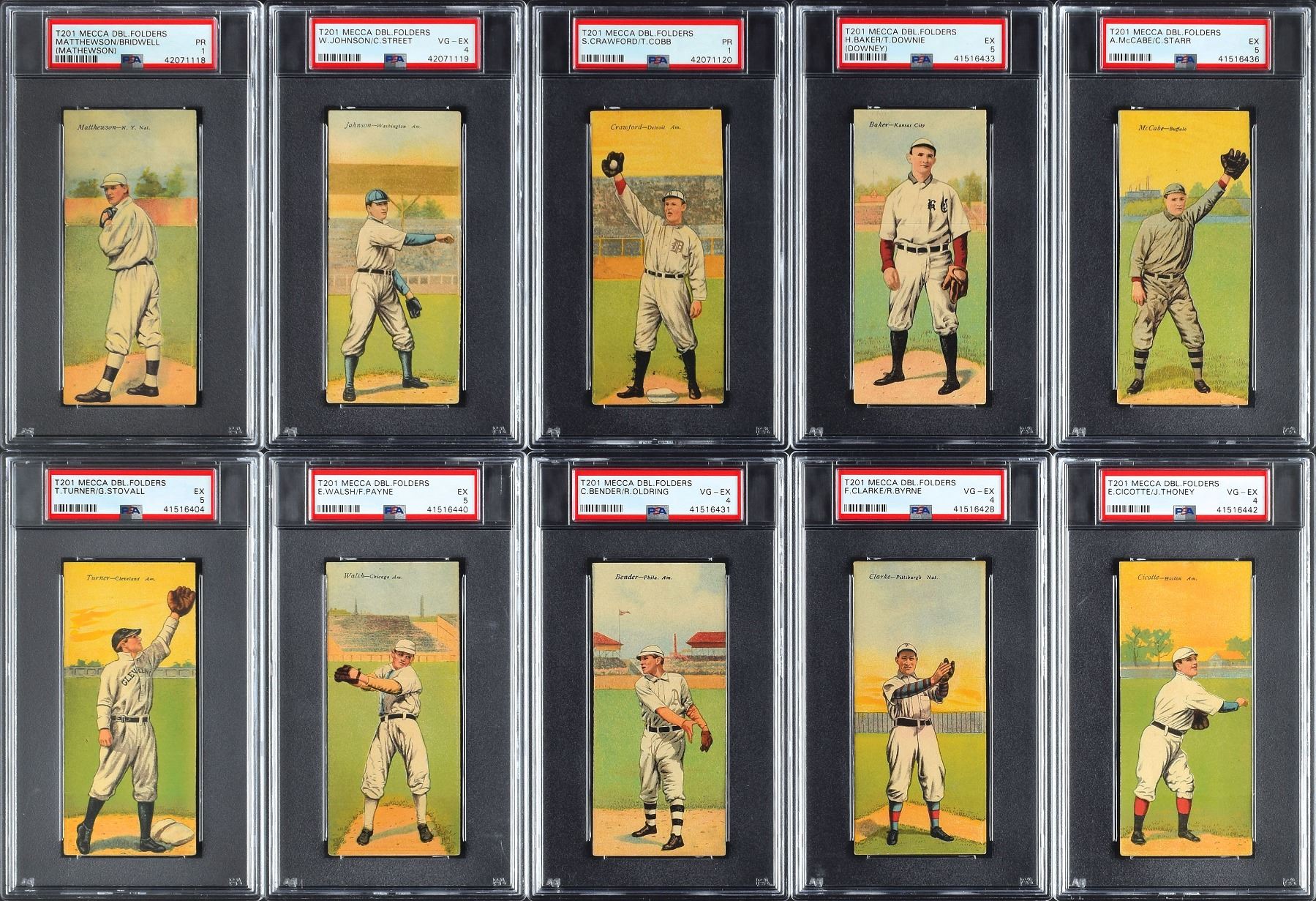 Completely PSA-graded T201 Mecca Double Folders complete set. Total of 50 cards with some of the biggest names in the sport from that era with Ty Cobb, Christy Mathewson, Walter Johnson, Tris Speaker and Eddie Collins. This fully graded set is listed on the PSA Set Registry and is the 38th Finest Set listed, but one of only 20 registered sets which are 100% complete. While only having a 2.685 overall grade, this set appears much nicer than the technical grades. Overall eye appeal far exceeds the technical grades.