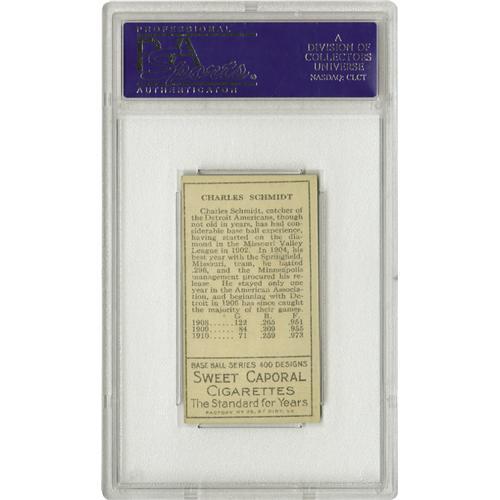 <B>1911 T205 Boss Schmidt PSA NM 7.</B></I> A brawler who boxed an exhibition with Heavyweight Champ Jack Johnson, Schmidt became the leader of three Tiger pennant winners (1907-09) by whipping Ty Cobb in several fights. Nice corners. Good clean image. Only one other card in this set grades higher. Sweet Caporal back.