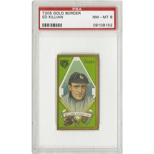 <B>1911 T205 Ed Killian PSA NM-MT 8.</B></I> A hero in Detroit when he won both games of a doubleheader against Boston to clinch the 1907 pennant, Killian was the hardest pitcher to homer against in ML history. Terrific borders. Sharp corners. Stands alone as the highest graded card in this set! Sweet Caporal back.