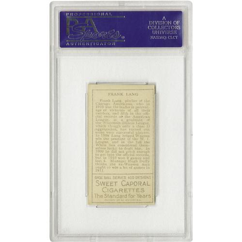 <B>1911 T205 Frank Lang PSA NM 7.</B></I> The White Sox curveballer battled arm problems but fanned thirteen against New York on September 20, 1910. He compiled a .500 record over the next two years but was released in mid-1913. Wonderful coloring. The highest graded card in this set shared with two others. Sweet Caporal back. <BR><BR><B>Important notice:<