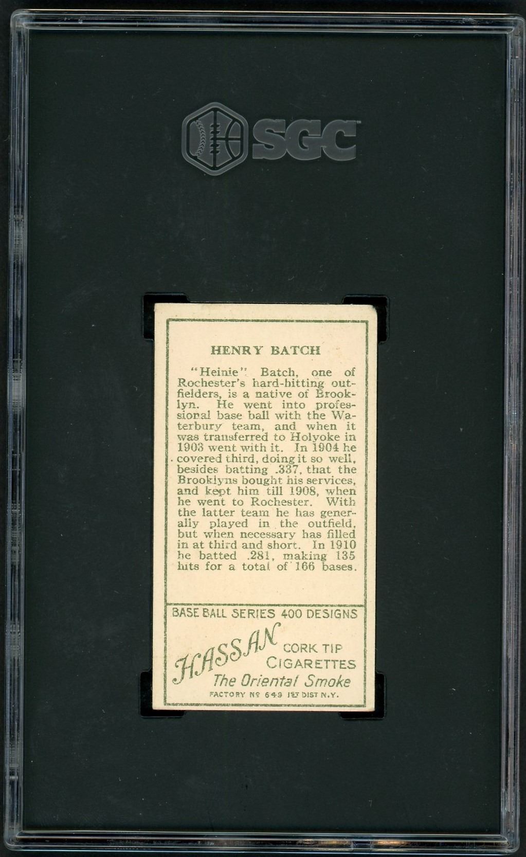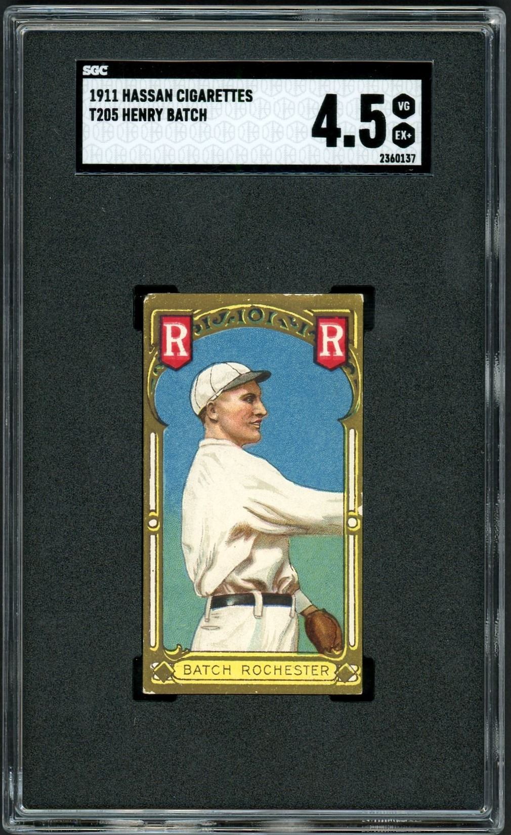 Very nice example of this great gold border card. Batch played 13 seasons or pro ball, including a handful in the majors with Brooklyn. This minor league card boasts one of the more unique designs within the T205 set, leading to it being a bit more of a demand card. This one grades a superb 4.5 VG-EX+ by SGC.