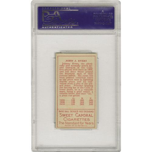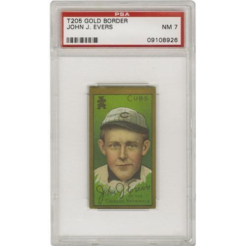 <B>1911 T205 Gold Border John J. Evers PSA NM 7.</B></I> One third of the famous Hall of Fame double-play combo for the Chicago Cubs. Only tiny specks of wear at three corners discourage an even higher grade for this remarkably well-preserved specimen. In close to one hundred submissions, not a single representation of this card has ever topped this one.<BR><BR><b>Shipping:</b> Sportscard (<a target="_blank" href="http://www.heritageauctions.com/common/shipping.php">view shipping information</a>)