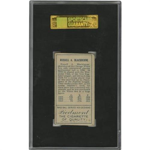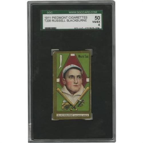 <B>1911 T205 Gold Border Russel Blackburne SGC VG-EX 50.</B></I> Lena Blackburne is known for discover the special Delaware River mud that was used to rub the gloss off of new baseballs. His entry in the T205 Gold border issue is made available here in a respectable VG-EX.<BR><BR><b>Shipping:</b> Requires 3rd Party Shipping (<a target="_blank" href="http://www.heritageauctions.com/common/shipping.php">view shipping information</a>)
