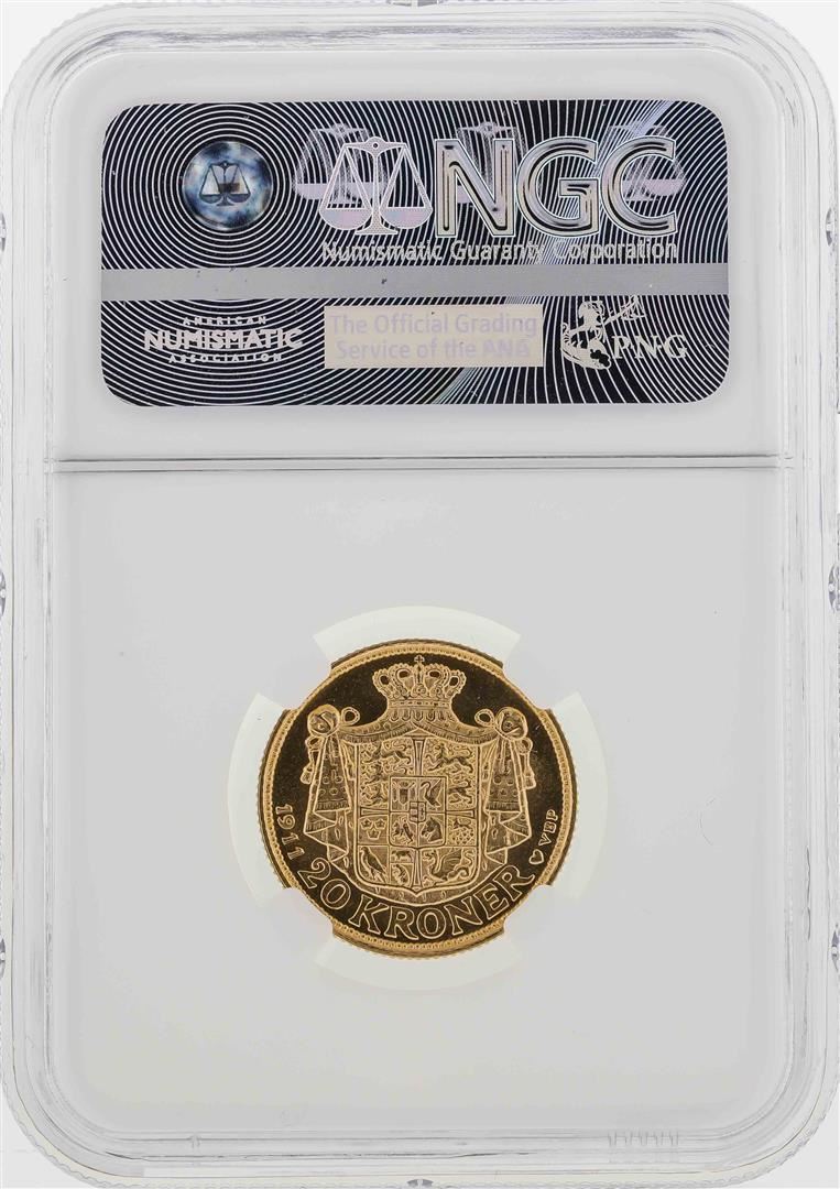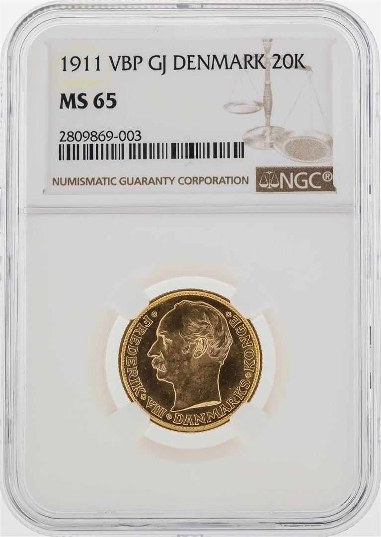 One 1911 VBP GJ Denmark 20 Kroner Gold Coin NGC MS65. NGC Certified.