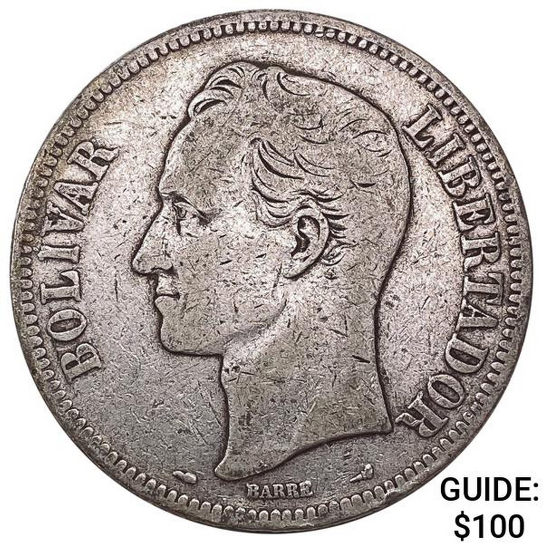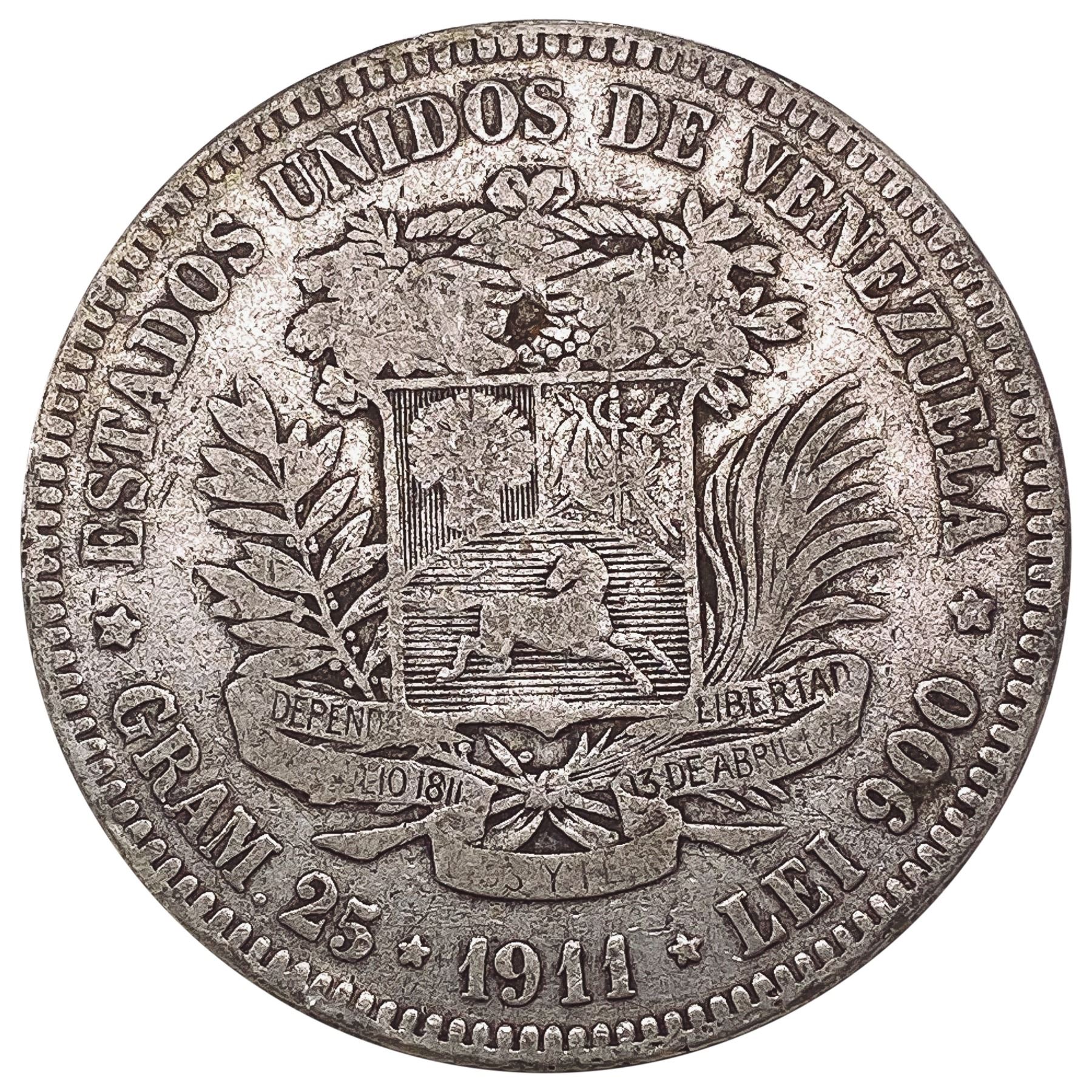 1911 Venezuela Silver 5 Bolivares NEARLY UNCIRCULATED