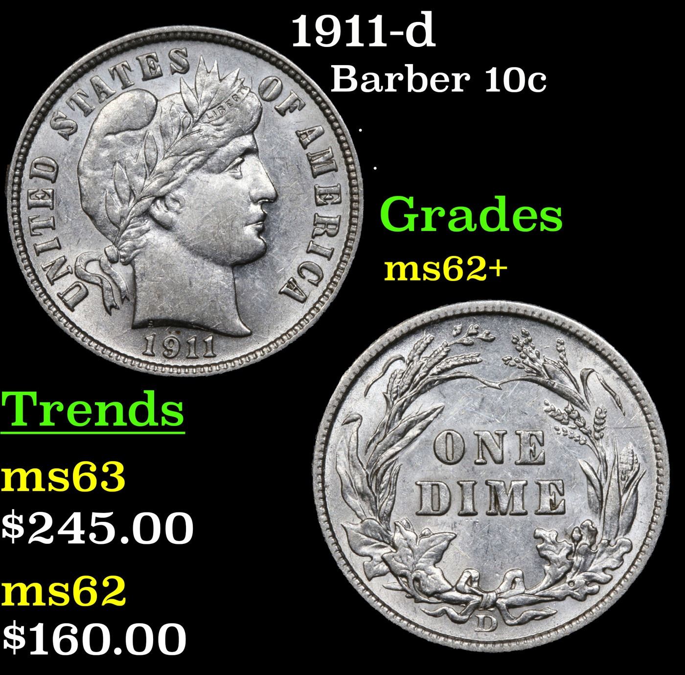 1911-d Barber Dime 10c Grades Select Unc.