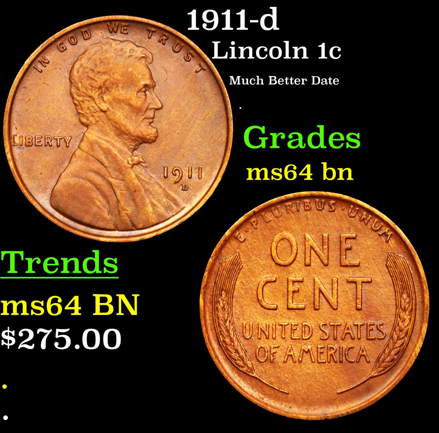 1911-d Lincoln Cent 1c Grades Choice Unc BN. Incredibly scarce date. Out of an original mintage of over 12 million,