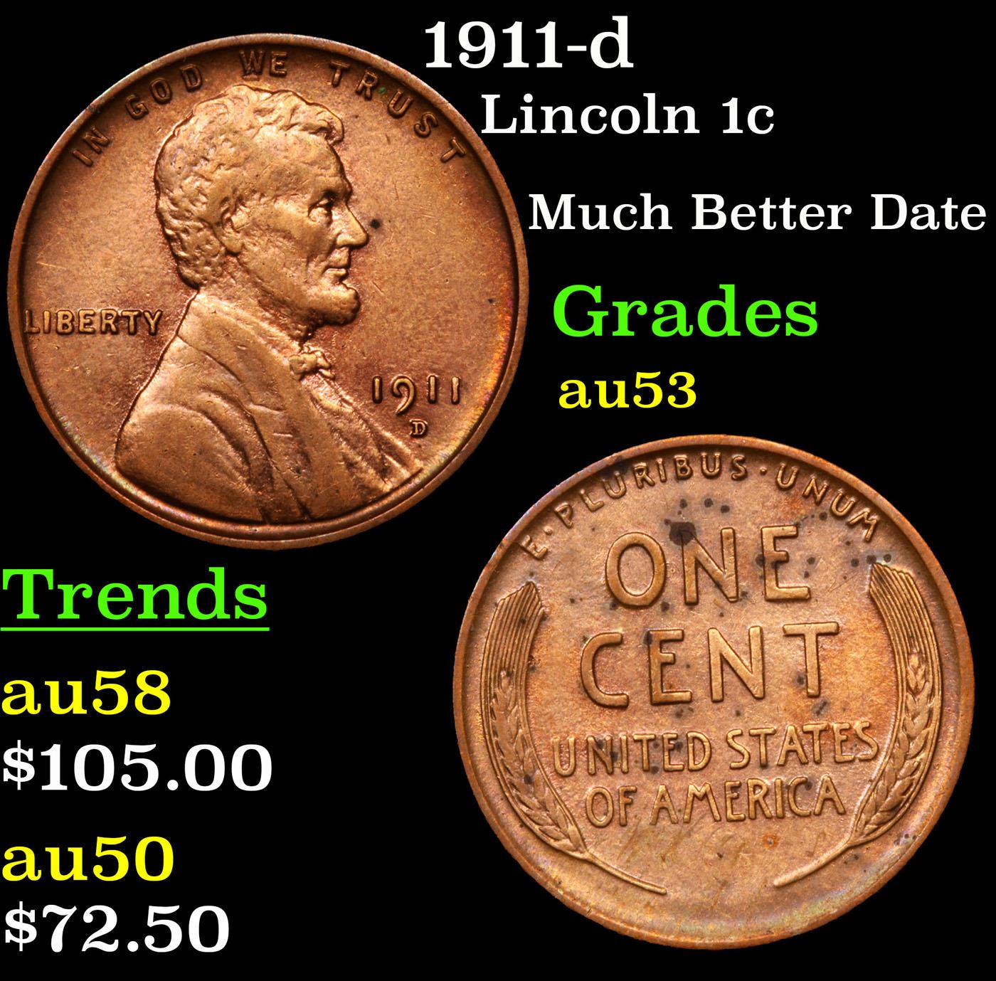1911-d Lincoln Cent 1c Grades Select AU. Incredibly scarce date. Out of an original mintage of over 12 million,