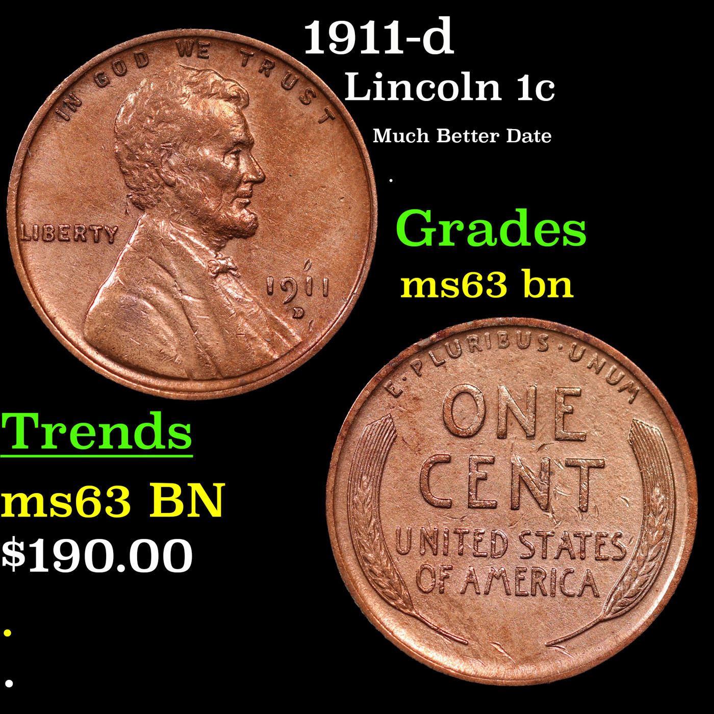 1911-d Lincoln Cent 1c Grades Select Unc BN. Incredibly scarce date. Out of an original mintage of over 12 million,
