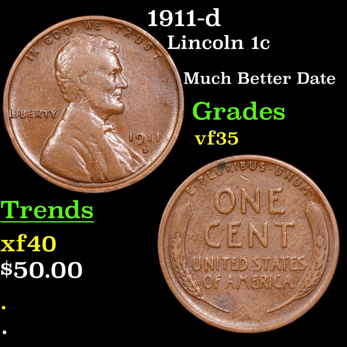 1911-d Much Better Date . Lincoln Cent 1c Grades vf++. Incredibly scarce date. Out of an original mintage of over 12 million, PCGS estimates only 500 survive in ms65 or better.