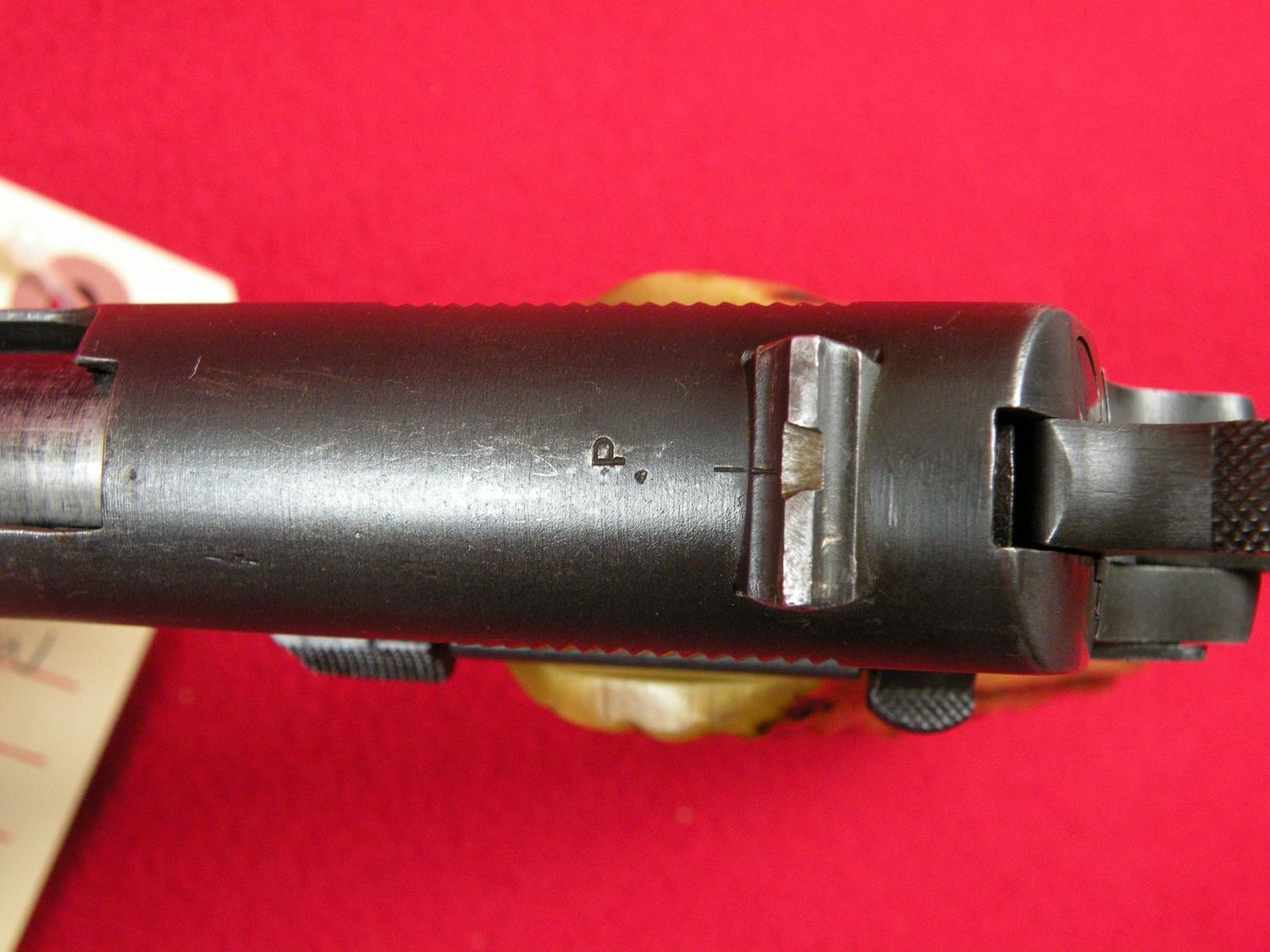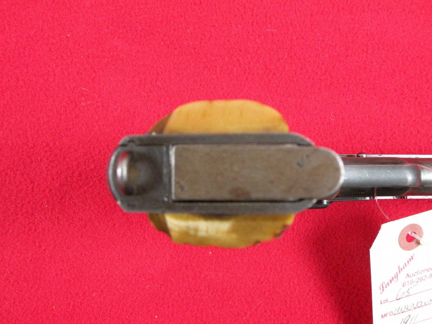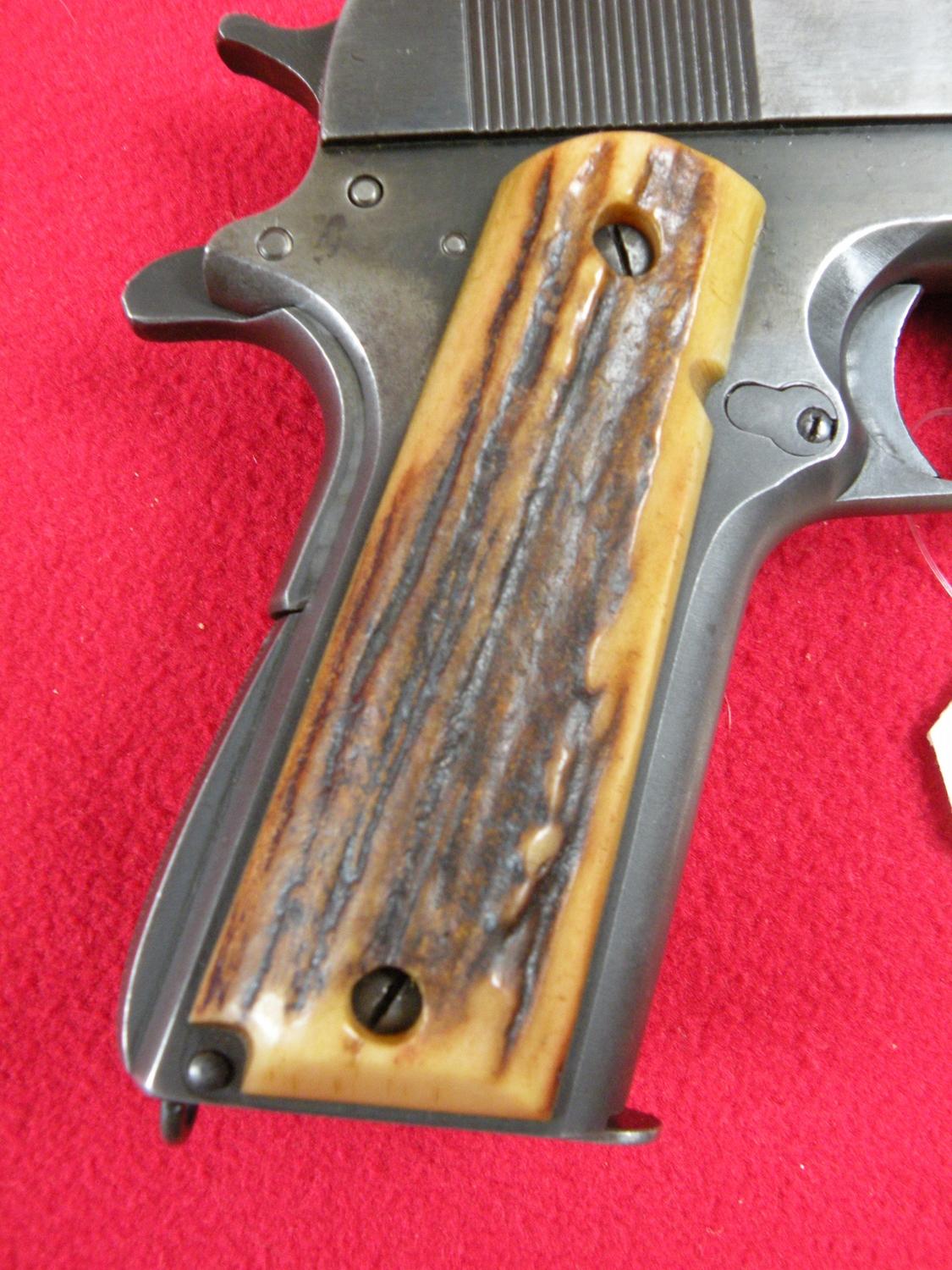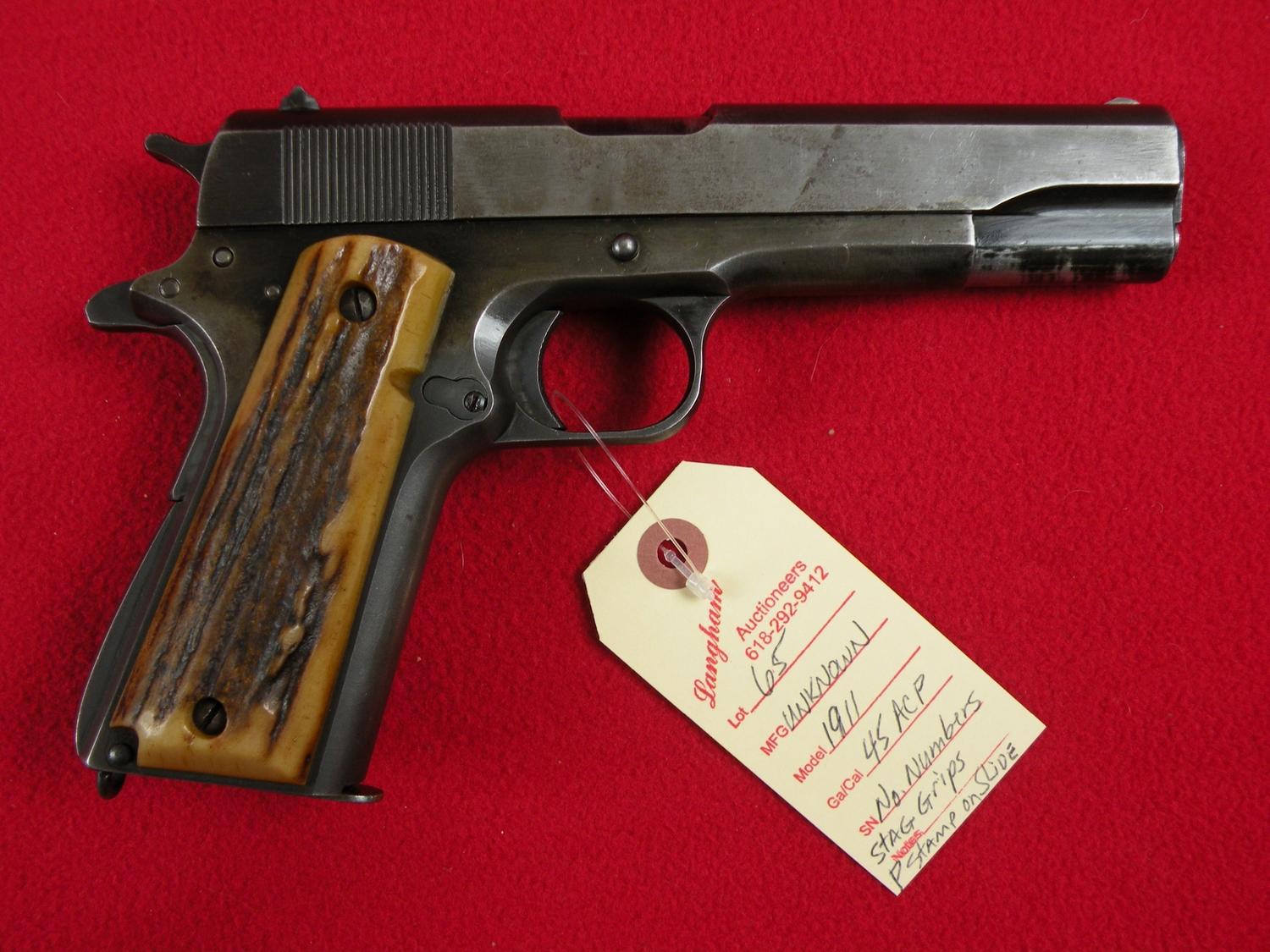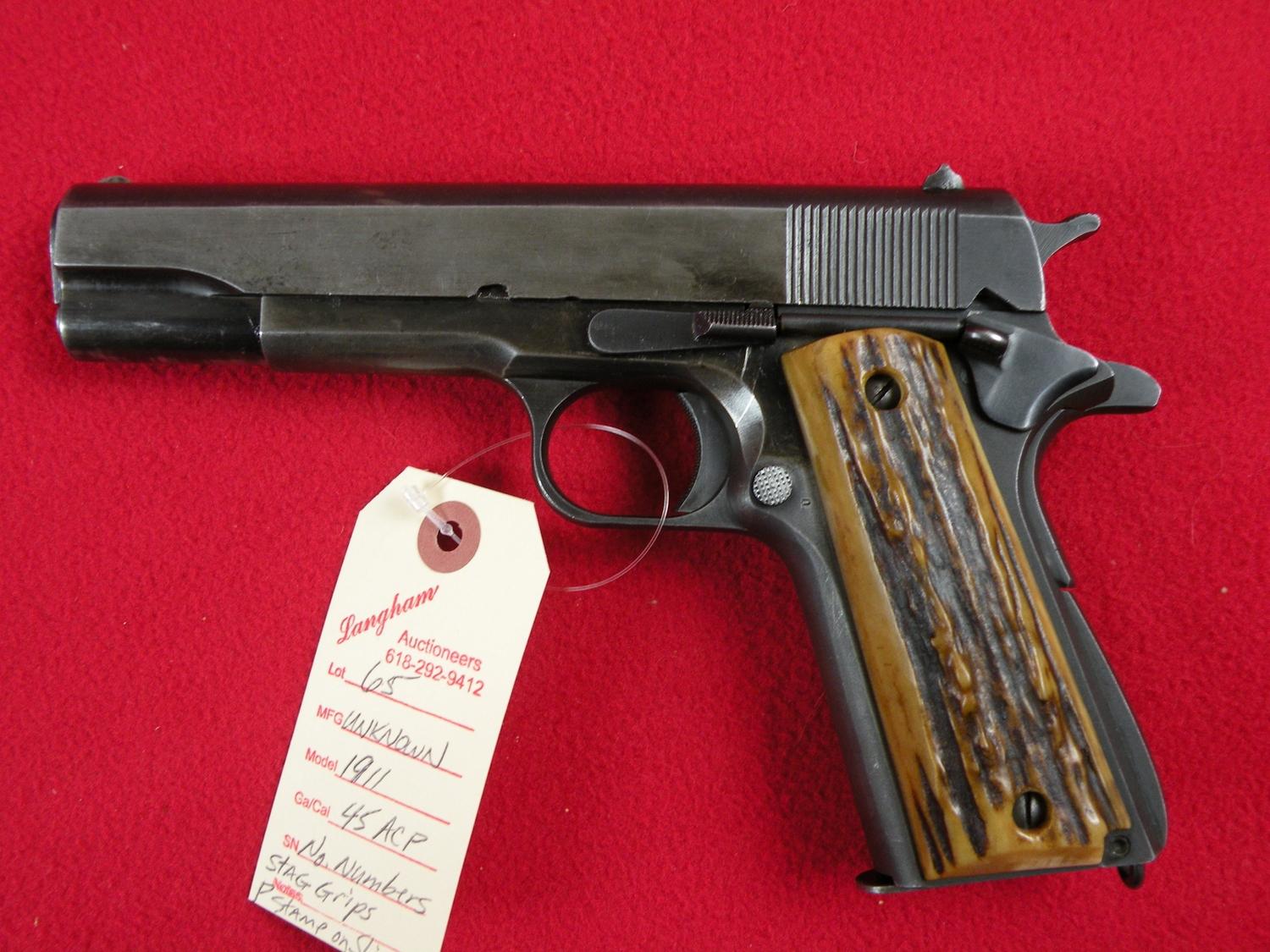 no numbers, stag grips, manufacturer unknown, P stamp on slide, grip safety