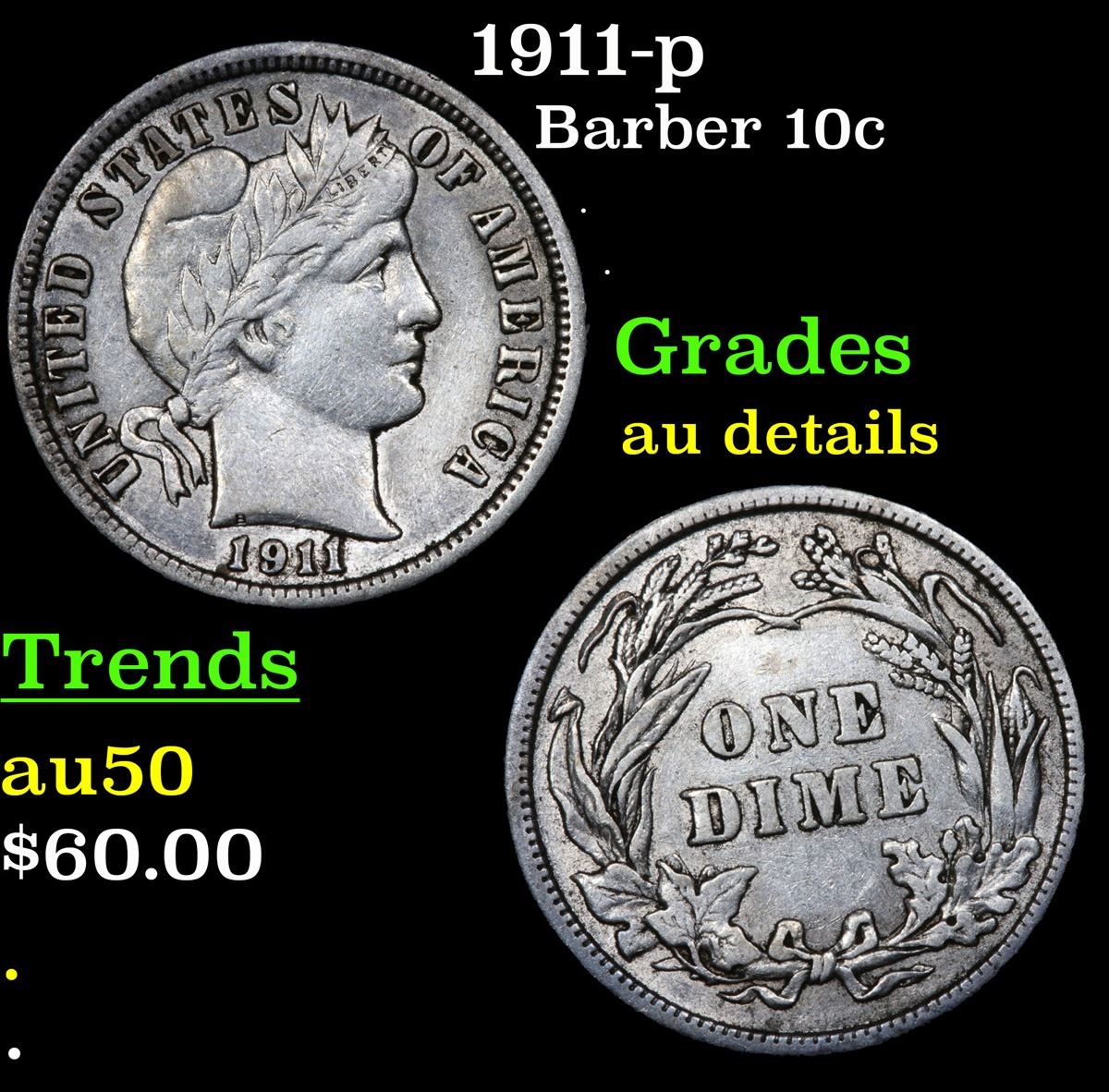 1911-p . . Barber Dime 10c Grades AU Details.