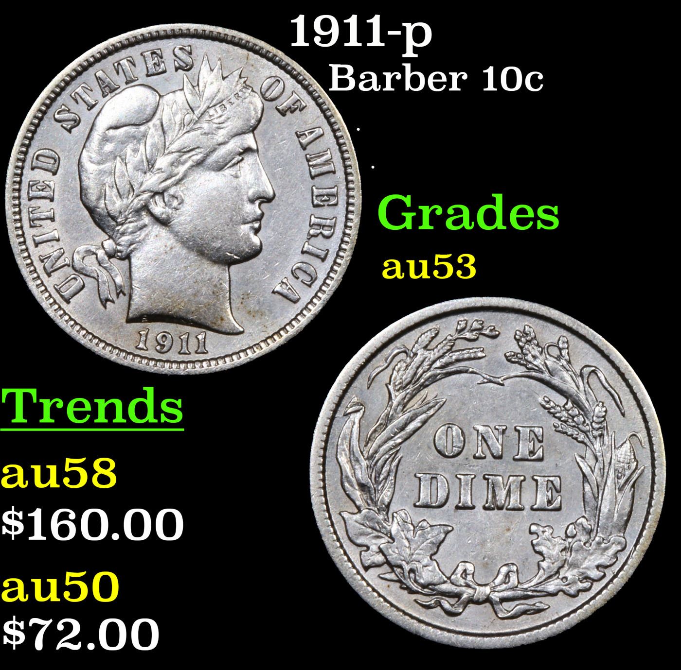 1911-p Barber Dime 10c Grades Select AU.