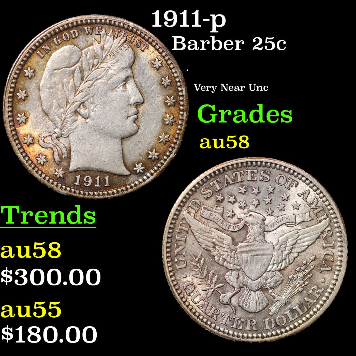 1911-p Barber Quarter 25c Grades Choice AU/BU Slider. Difficult date. Sought after and hard to find.
