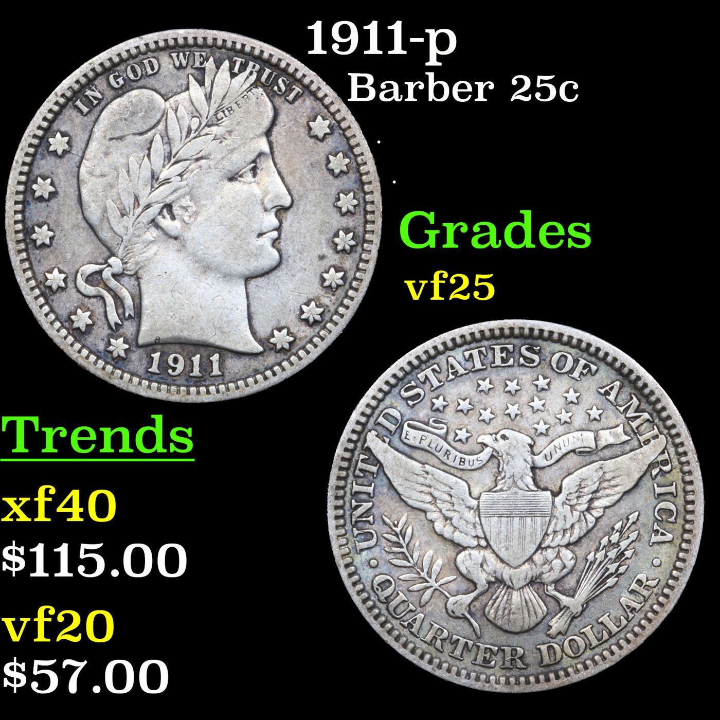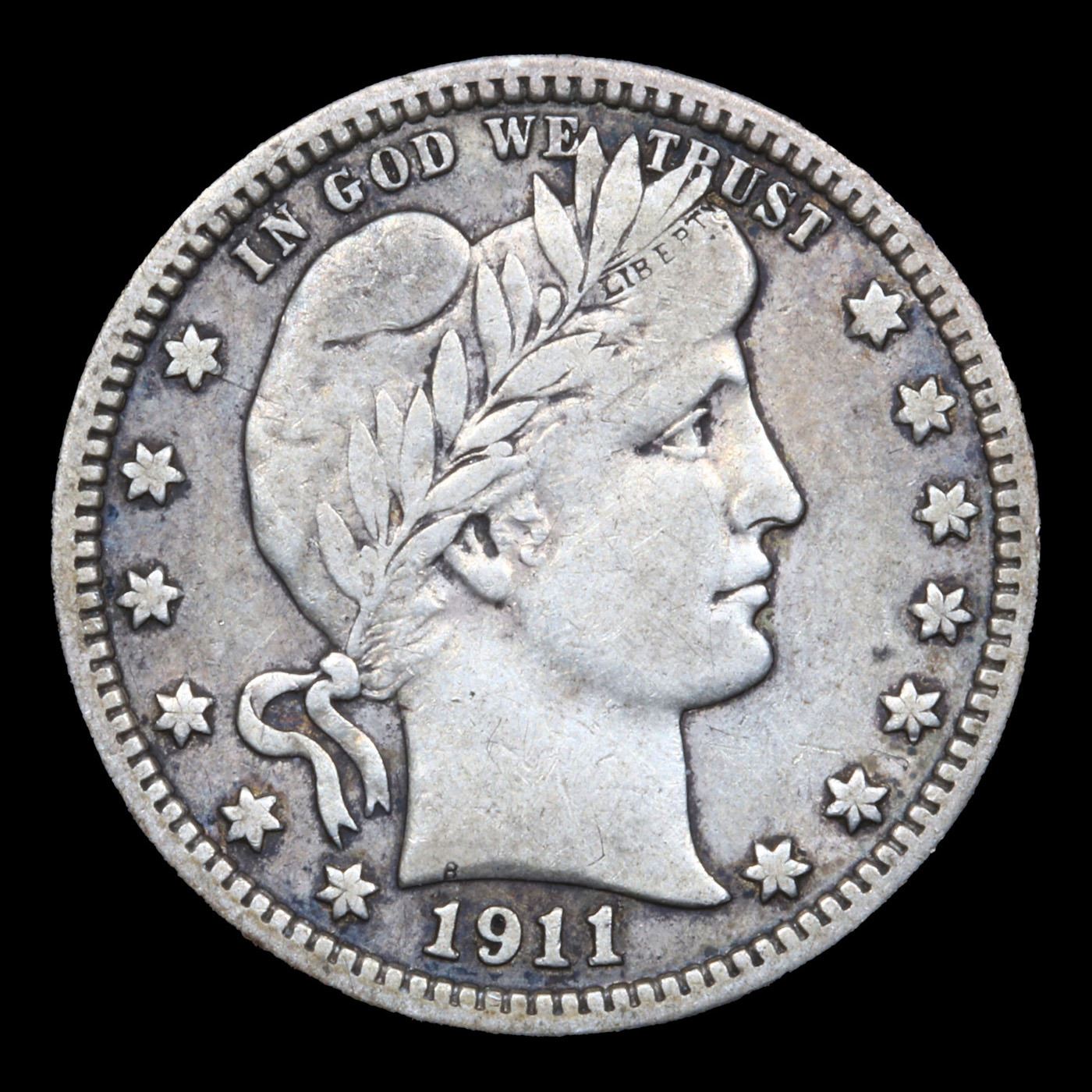 1911-p Barber Quarter 25c Grades vf+. Difficult date. Sought after and hard to find.