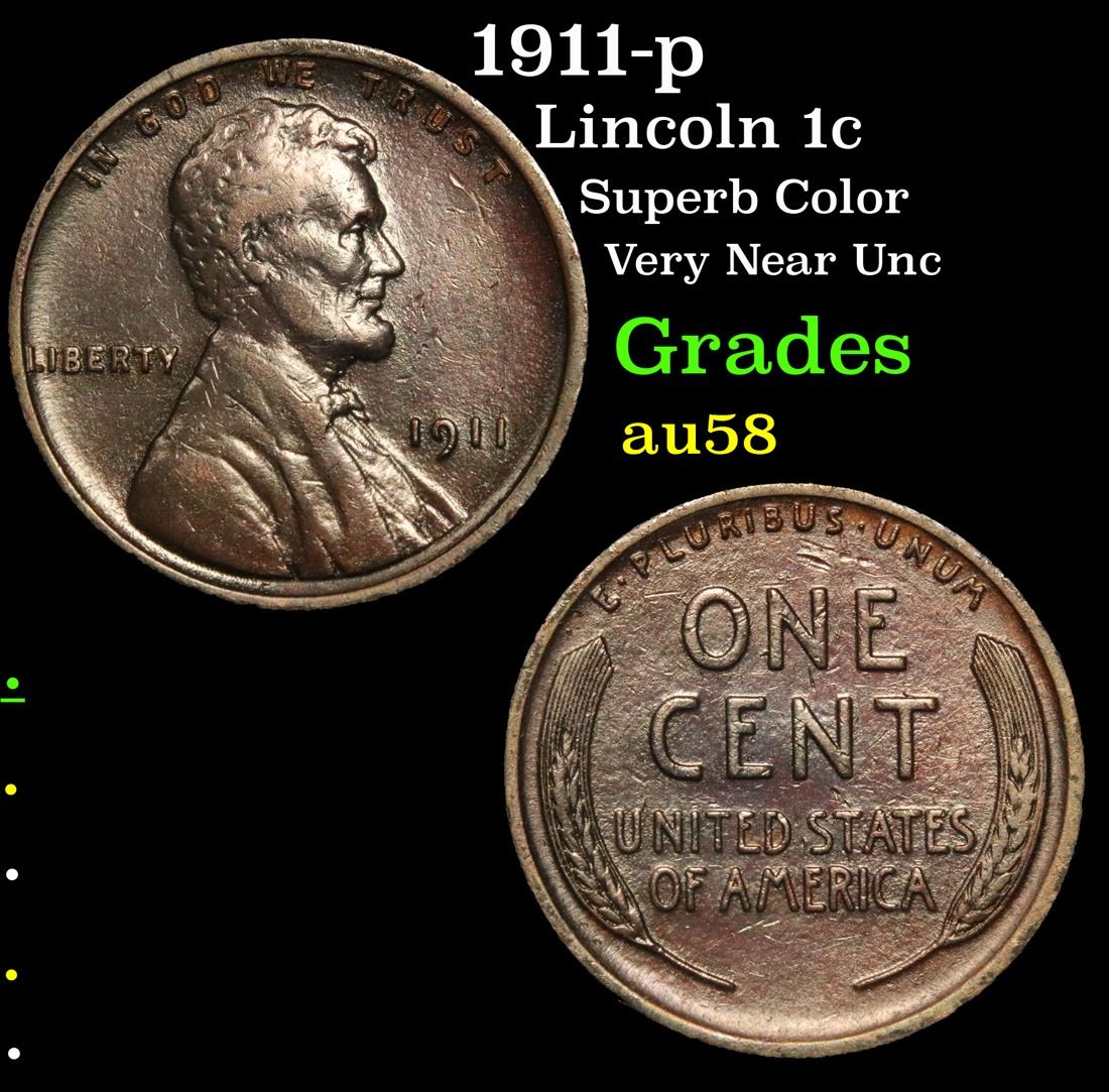 1911-p Superb Color Very Near Unc Lincoln Cent 1c Grades Choice AU/BU Slider.