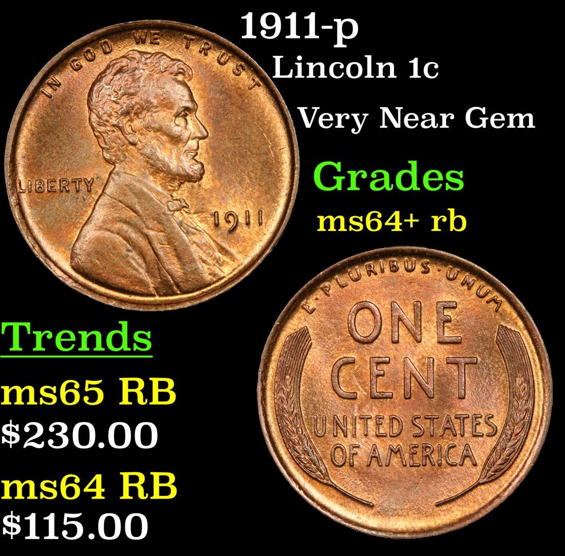 1911-p . Very Near Gem Lincoln Cent 1c Grades Choice+ Unc RB.