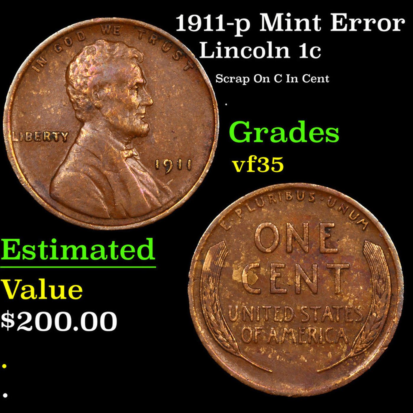 1911-p Mint Error Lincoln Cent 1c Grades vf++.