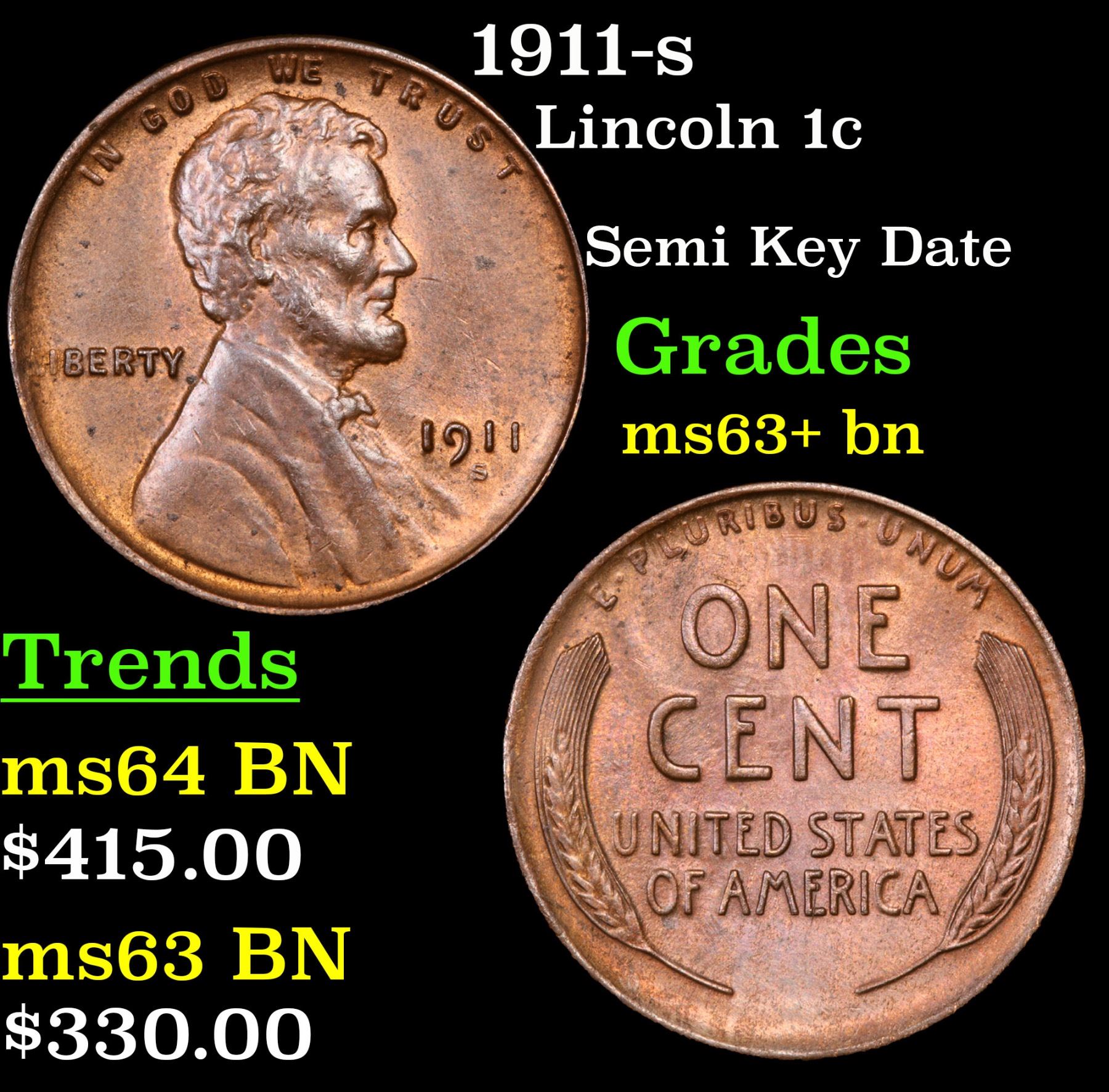 1911-s Semi Key Date . Lincoln Cent 1c Grades Select+ Unc BN. Incredibly scarce date. PCGS estimates that out of an original mintage of over 4 million coins struck, only 900 remain in all grades.