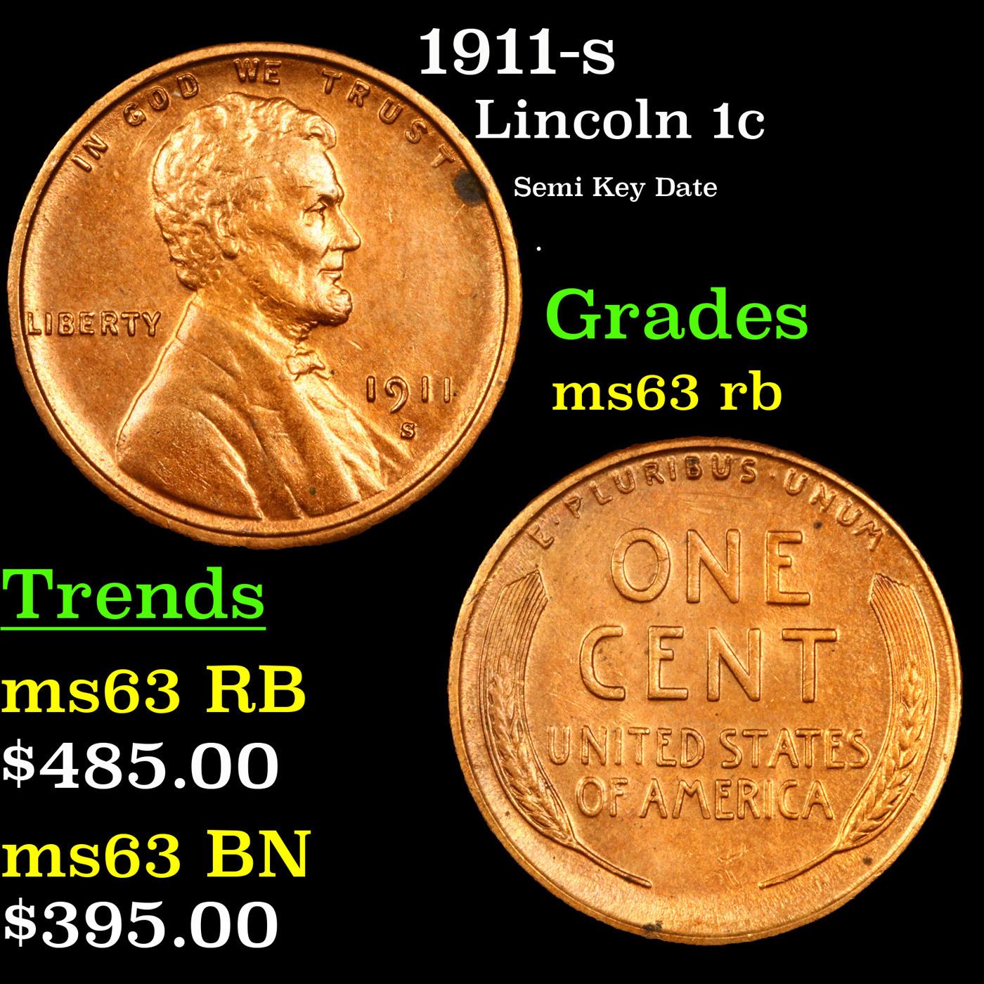 1911-s Lincoln Cent 1c Grades Select Unc RB. Incredibly scarce date. PCGS estimates that out of an original mintage of over 4 million coins struck, only 900 remain in all grades.