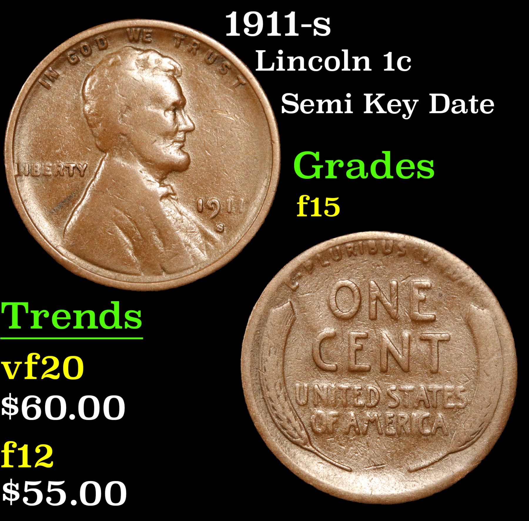 1911-s Lincoln Cent 1c Grades f+. Semi Key Date Incredibly scarce date. PCGS estimates that out of an original mintage of over 4 million coins struck, only 900 remain in all grades.