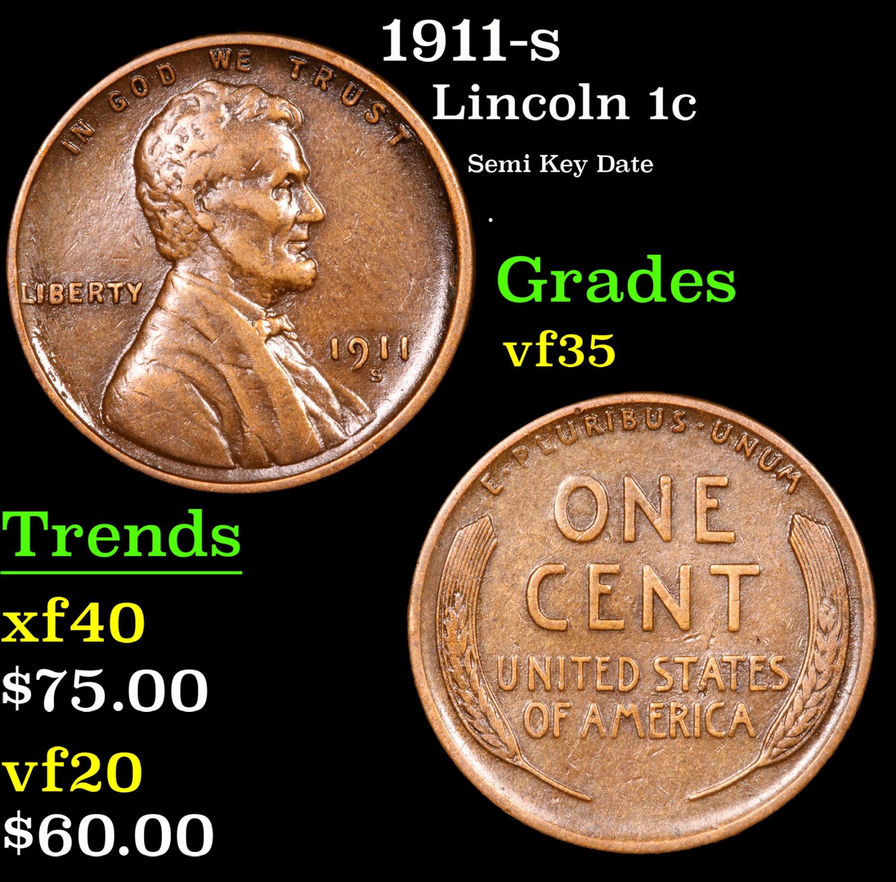 1911-s Semi Key Date . Lincoln Cent 1c Grades vf++. Incredibly scarce date. PCGS estimates that out of an original mintage of over 4 million coins struck, only 900 remain in all grades.