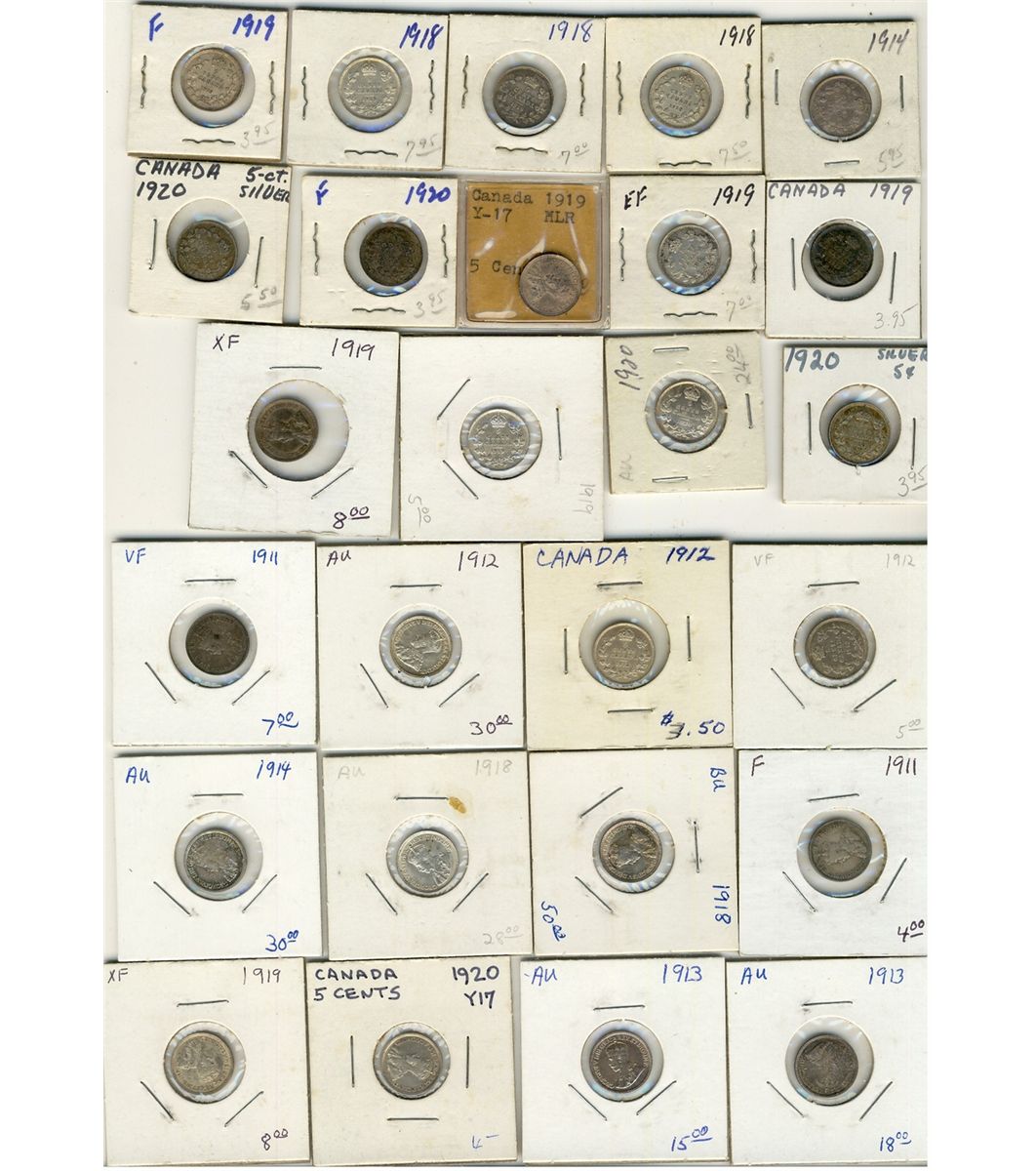 1911 to 1920 5 Cents Lot; Includes 32 pcs VG to UNC. A nice assortment, problem free with some duplicate dates.
