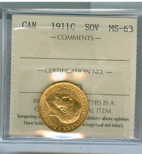 1911c Gold Sov ICCS MS63. Lots of lustre.
